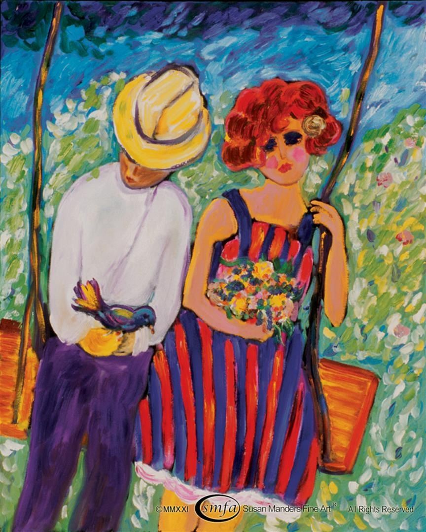 Susan Manders Original "Blue Birds is a 24x30" original oil on canvas. Serenity in the afternoon . Susan Manders Original was only the 2nd Woman selected as a US Olympic artist in 2004. Manders works are represented in fine collections internationally & archived by the National Museum of Women in the Arts ,Washington, DC. As the 2nd woman to be selected a US Olympic Artist, Manders joins an exclusive club of internationally acclaimed artists.