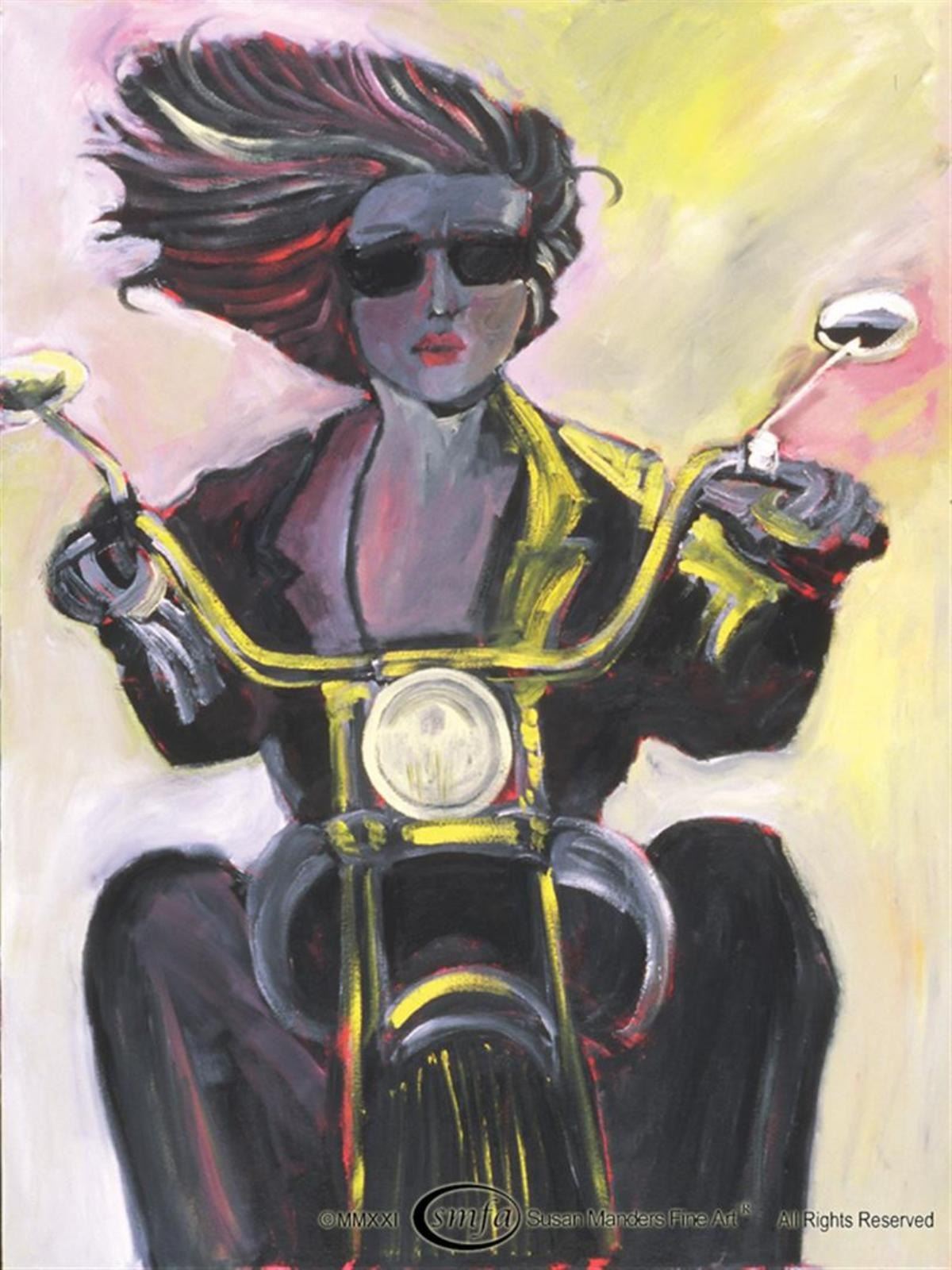 Susan Manders "Sleekster" is a 30x40" original oil on canvas. The Girl's gotta ride . Susan Manders is a National Award-winning artist. Susan Manders was only the 2nd Woman selected as a US Olympic artist in 1984.