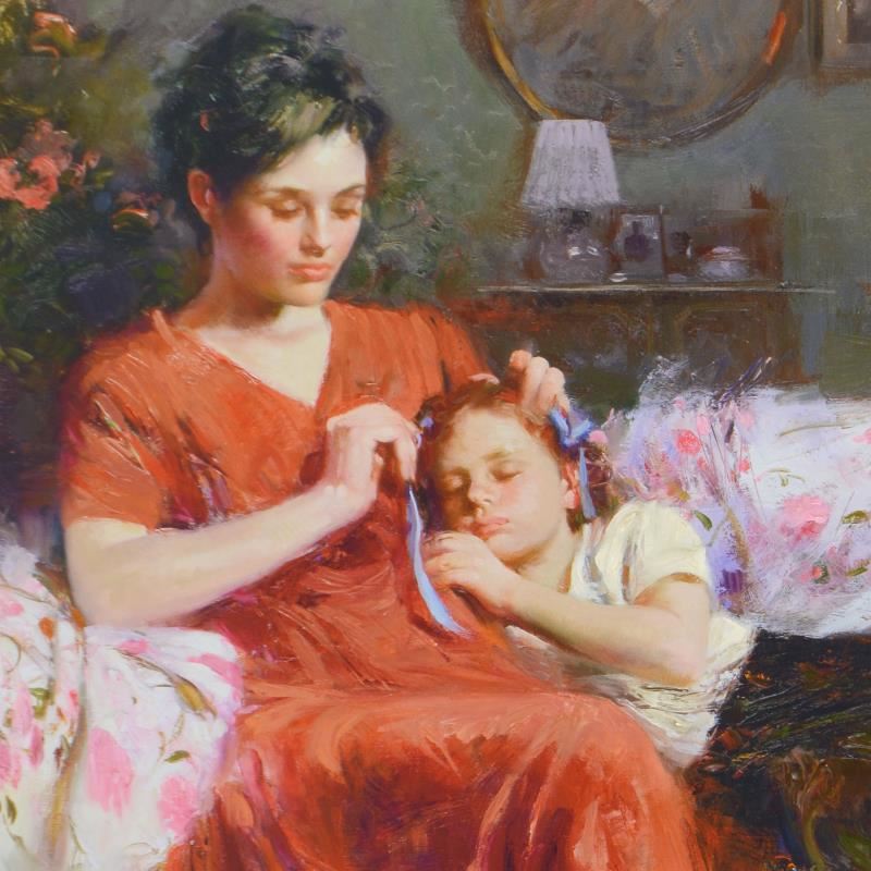 Pino's portraits allow glimpses into intensely personal, intimate spaces, conveying emotion through rich, warm color and sensual brushwork. "Sweet Love" is an artist-embellished limited edition giclee on canvas by Pino (1939-2010). The piece is numbered, hand signed, and includes certificate of authenticity. Measures approximately 30" x 40.5" (image).