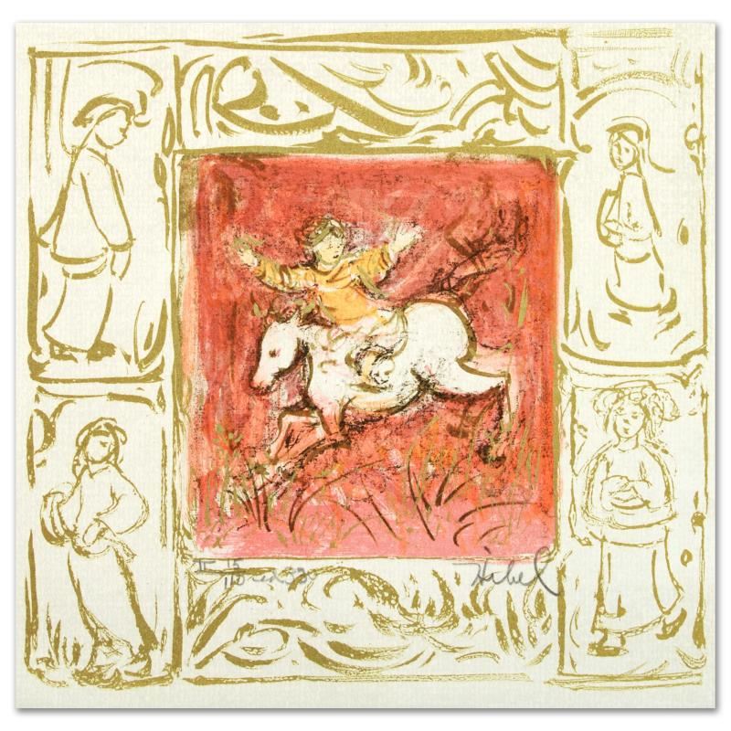 "Swift Rider" is a limited edition lithograph on paper, numbered and hand signed by Edna Hibel (1917-2014). Includes Certificate of Authenticity! Measures approx. 7.5" x 7.5" (no border).