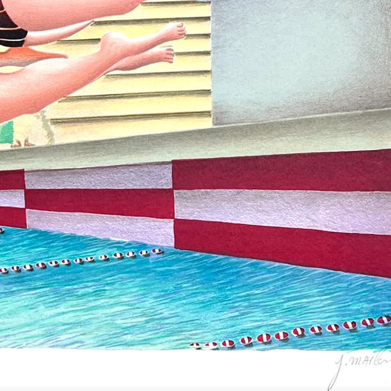 "Swimming" is a limited edition serigraph on paper by Yuval Mahler. The piece comes hand signed by the artist, numbered, and with a letter of authenticity. Measures approximately 13" x 19.5".