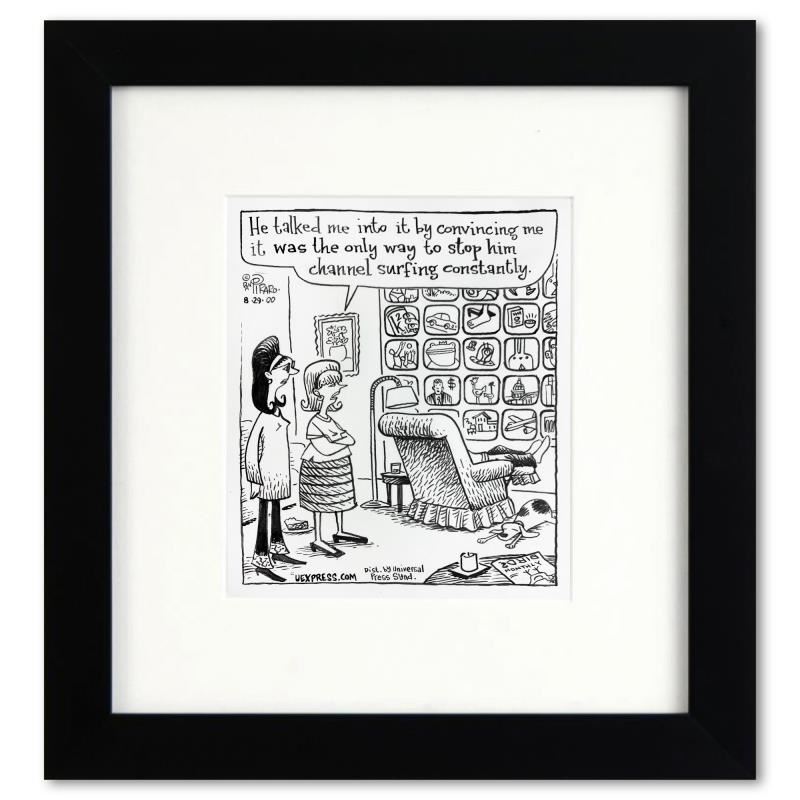 Enter a surreal and satirical world of twisted imagination and award winning creativity. "TV Wall" is an original pen & ink drawing on paper by Dan Piraro, creator of the critically acclaimed and award winning comic strip, Bizarro. This piece is hand sign