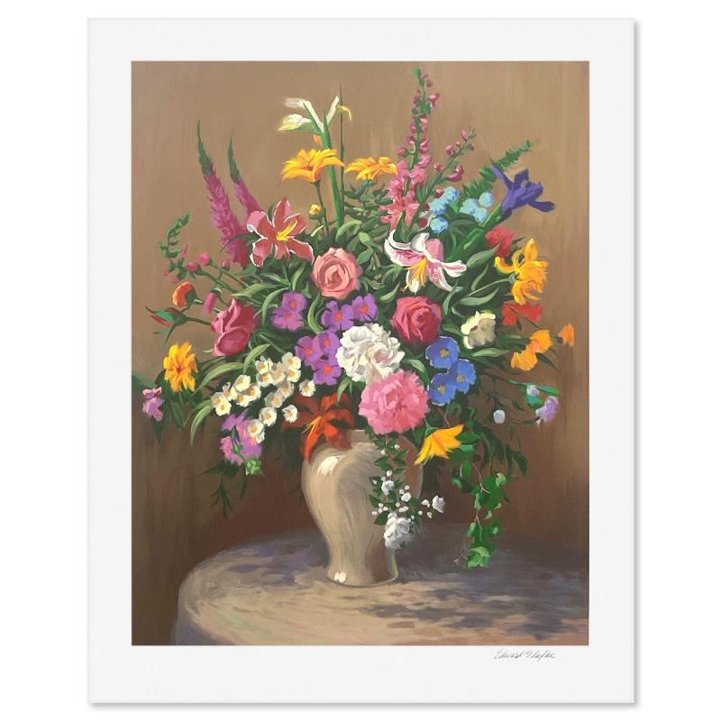 "Table Bouquet" is a limited edition printer's proof on paper by Edward Glafke, numbered and hand signed by the artist. Includes Letter of Authenticity. Measures approx. 30" x 24" (border), 25.5" x 20" (image).