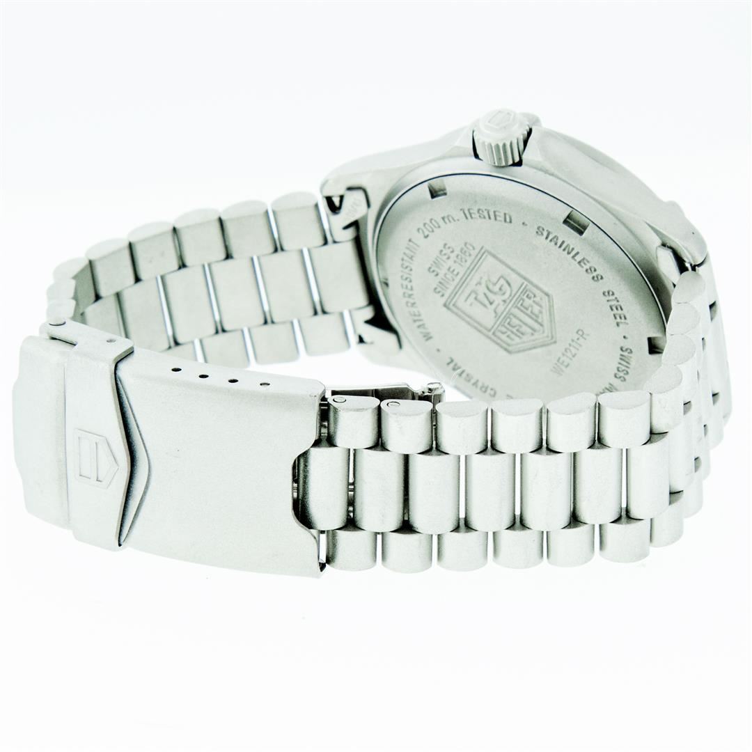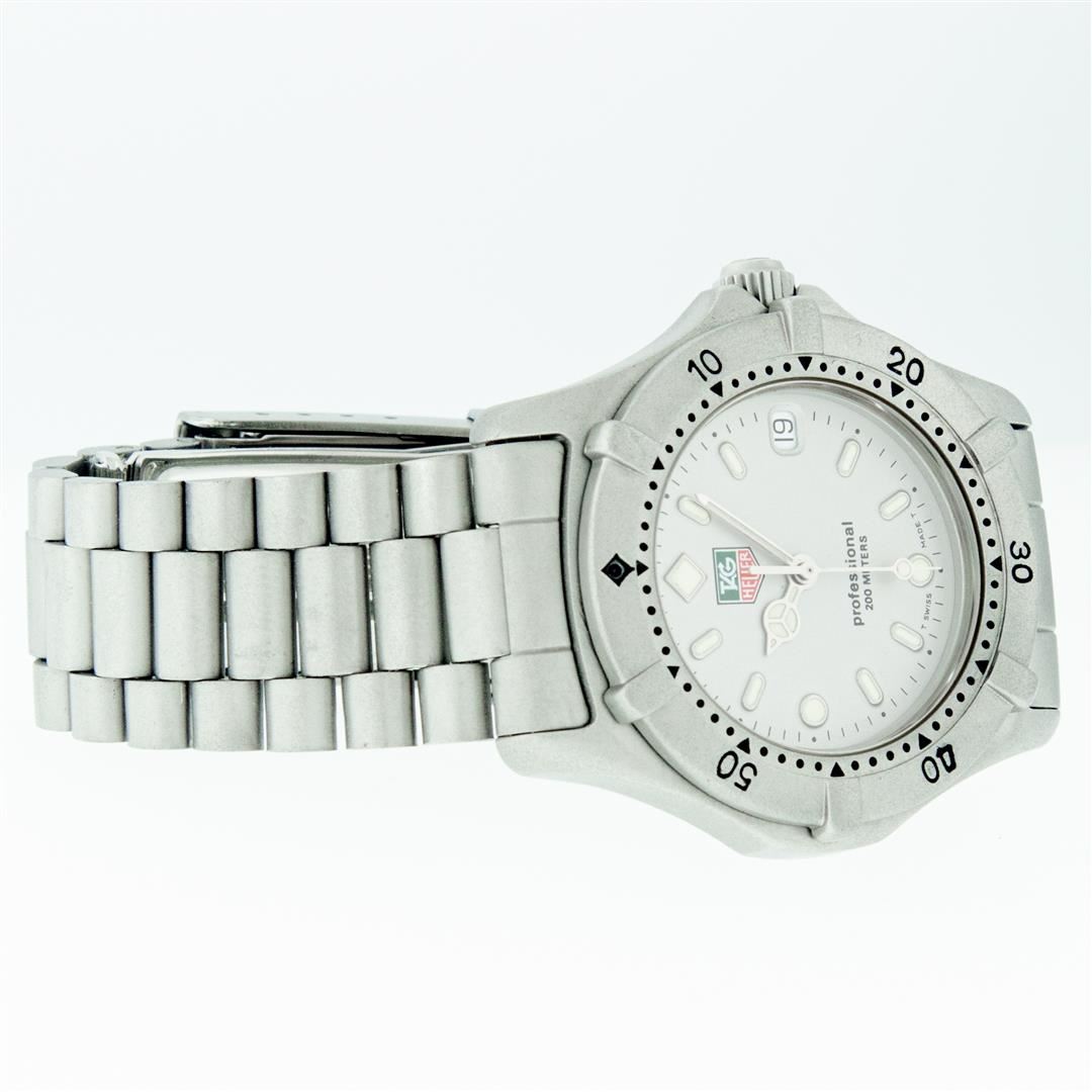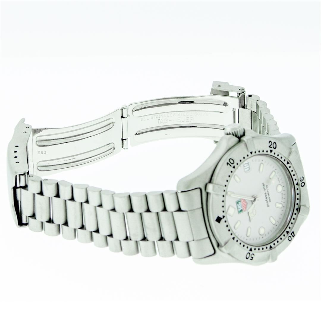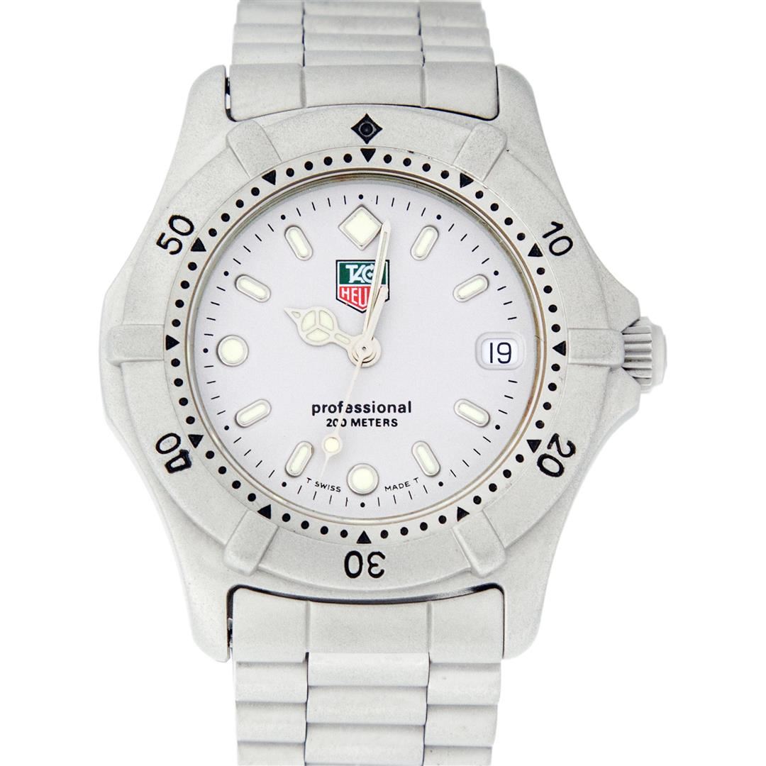 One Midsize Unisex Tag Heuer Stainless Steel 2000 Series Professional Polished with Satin Finish, This Watch Has A Brand New Battery & Has Been Time Tested, Stainless Steel Case: 34mm, Stainless Steel Crown. Bezel: Stainless Steel Rotating Bezel, Crystal: Sapphire Crystal. Hands: Tag Heuer Luminiscent Hands, Movement: Swiss ETA Cal. 955, Dial: Tag Heuer Grey Dial With Lumi Hour Markers, Window: 3 O'Clock Position Date Display, Model: TAG Heuer Professional. Condition: G-6 Extra Fine. Bracelet: Tag Heuer Stainless Steel Band, Satin Finish. 5.5 Inch Length, Adjustable. Standard Double Fold Clasp with Tag Heuer Logo. It Is Free Of All Scratches And Dents. This Is A Unisex Midsize Watch.