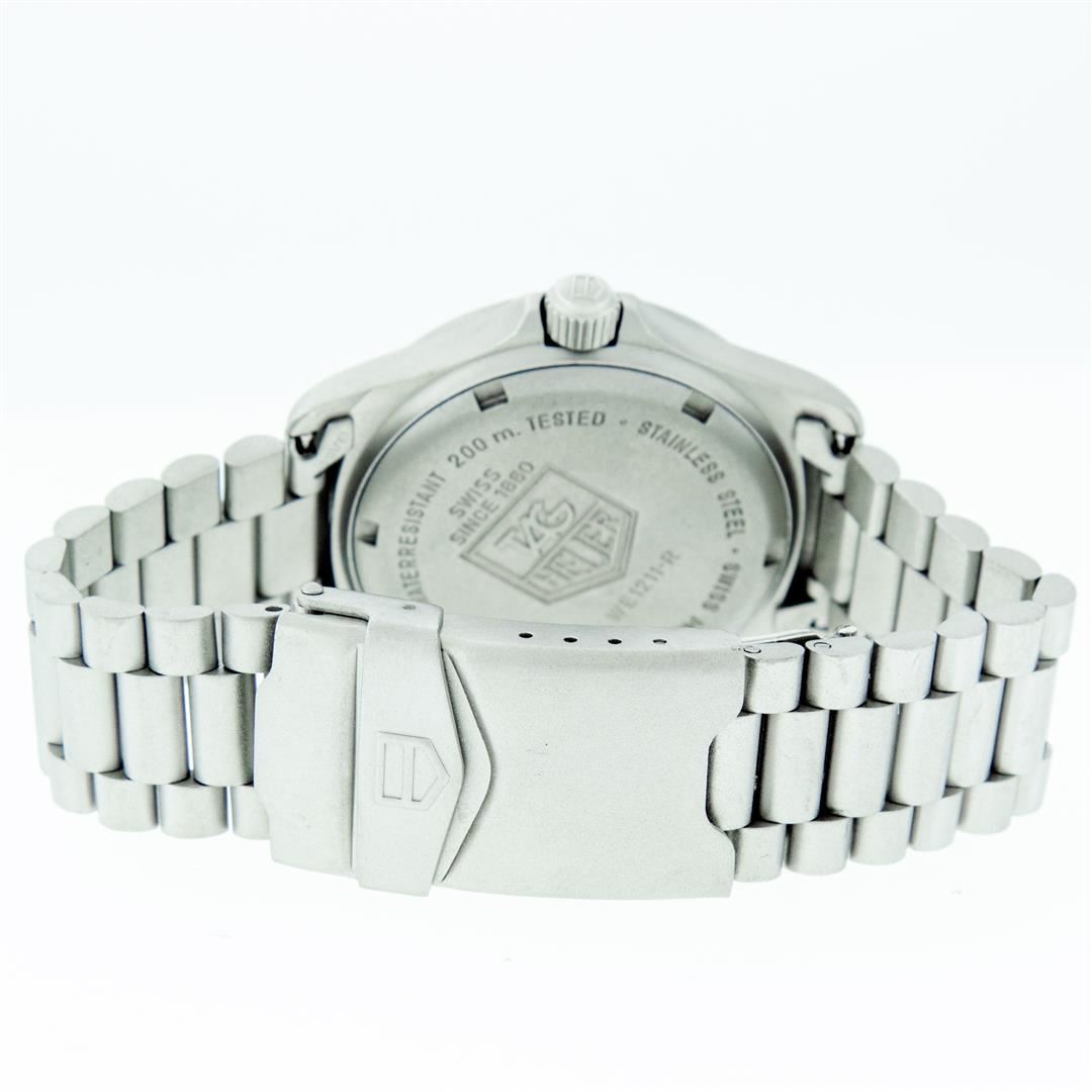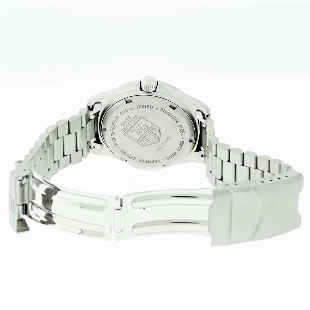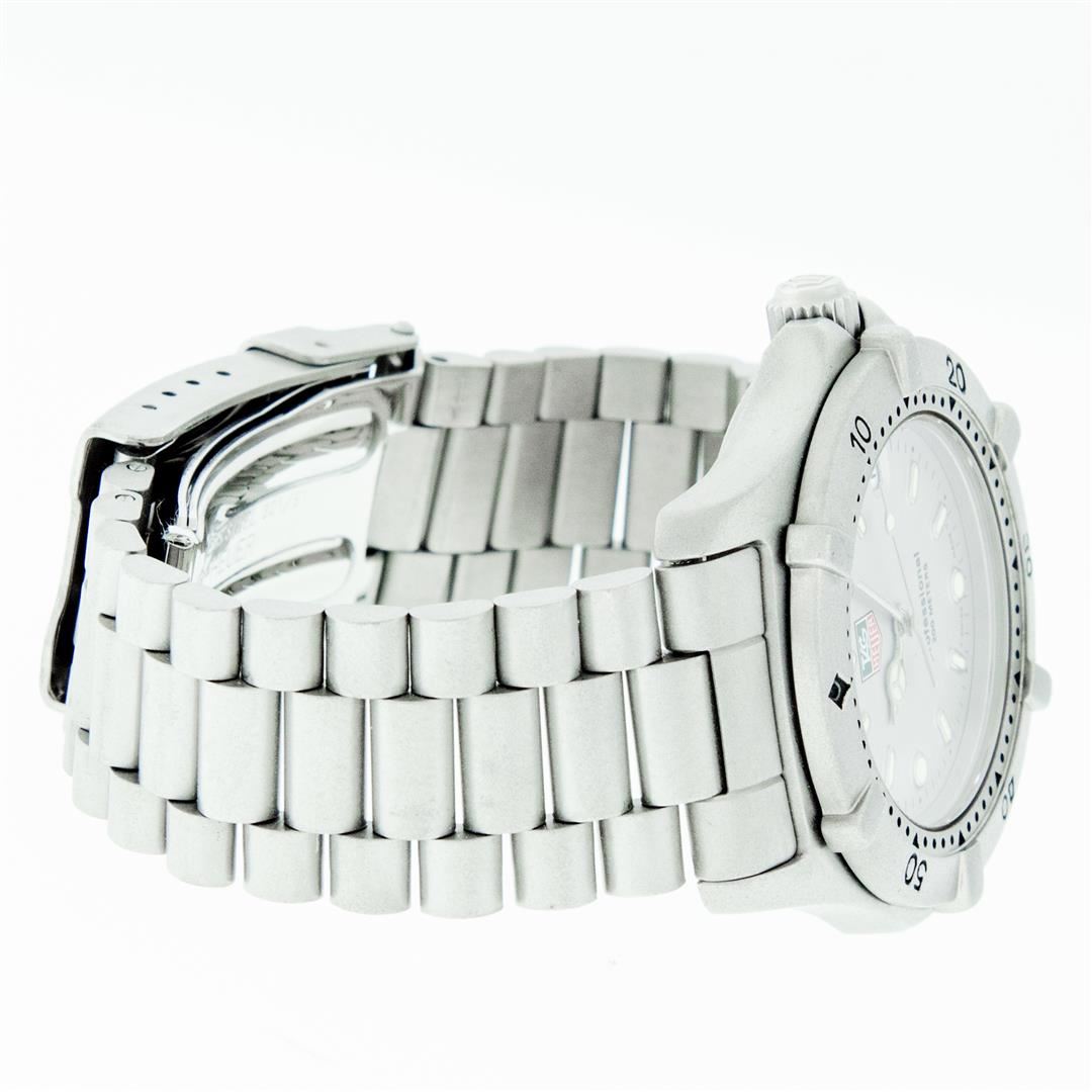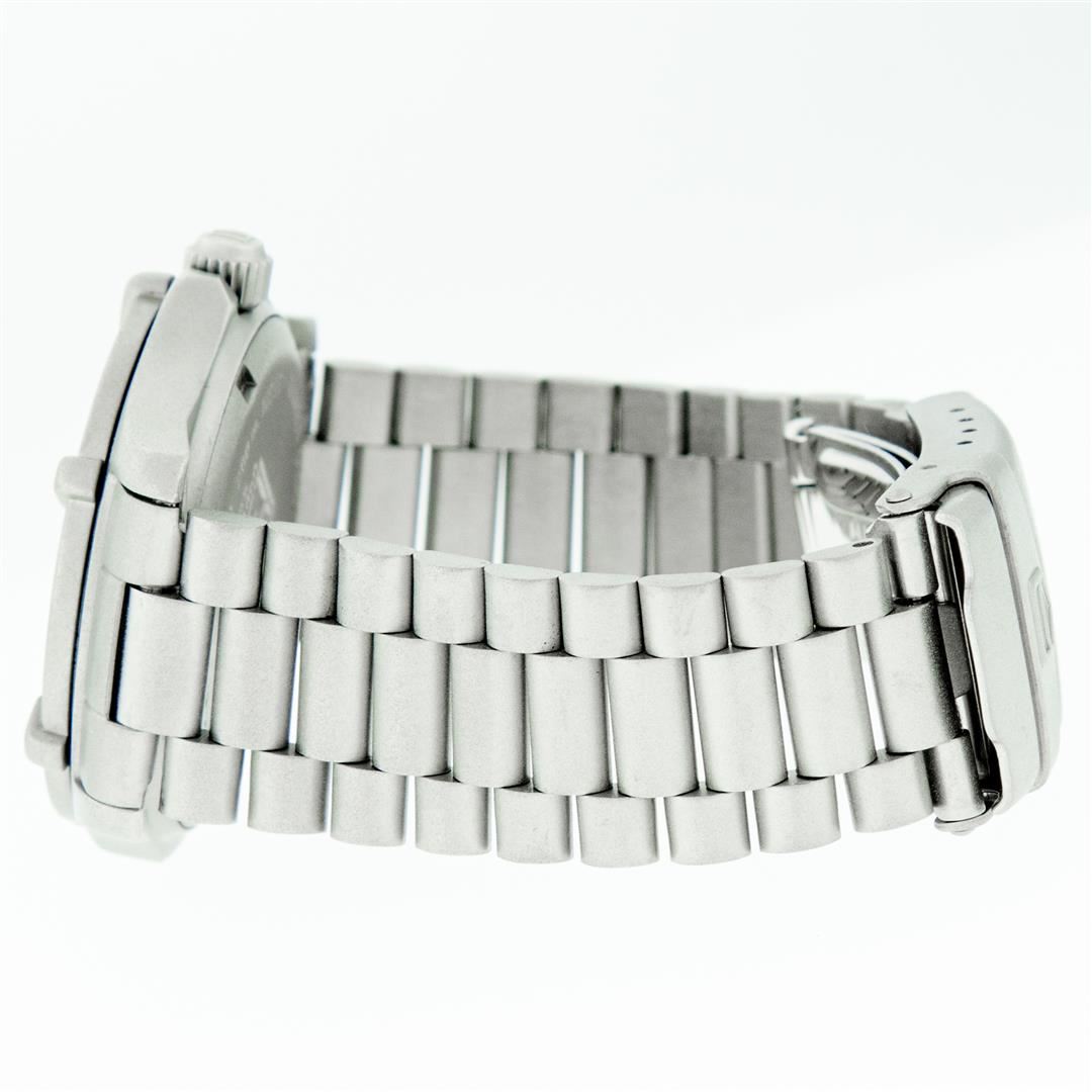 One Midsize Unisex Tag Heuer Stainless Steel 2000 Series Professional Polished with Satin Finish, This Watch Has A Brand New Battery & Has Been Time Tested, Stainless Steel Case: 34mm, Stainless Steel Crown. Bezel: Stainless Steel Rotating Bezel, Crystal: Sapphire Crystal. Hands: Tag Heuer Luminiscent Hands, Movement: Swiss ETA Cal. 955, Dial: Tag Heuer Grey Dial With Lumi Hour Markers, Window: 3 O'Clock Position Date Display, Model: TAG Heuer Professional. Condition: G-6 Extra Fine. Bracelet: Tag Heuer Stainless Steel Band, Satin Finish. 5.5 Inch Length, Adjustable. Standard Double Fold Clasp with Tag Heuer Logo. It Is Free Of All Scratches And Dents. This Is A Unisex Midsize Watch.