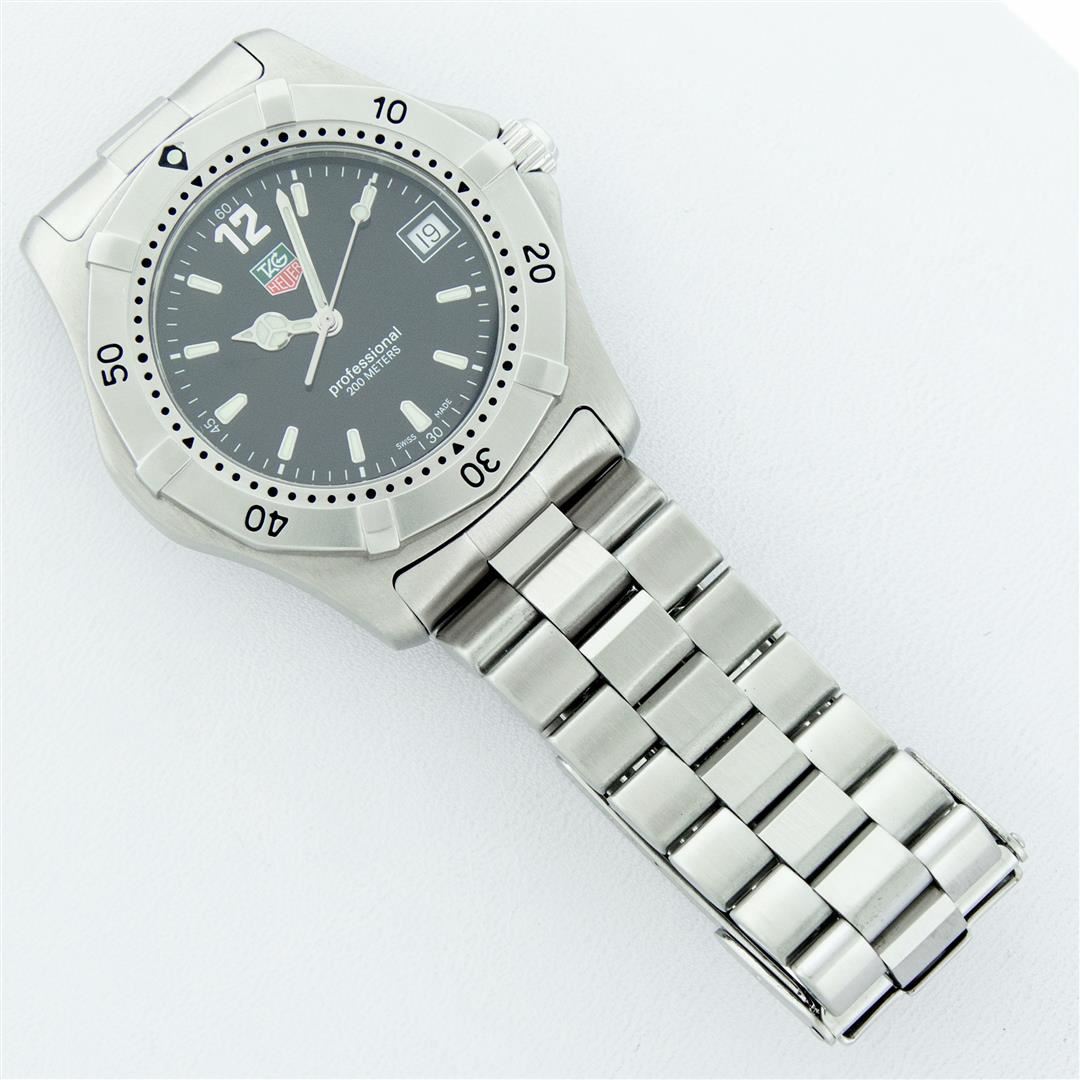 One Unisex Tag Heuer Stainless Steel 2000 Series Professional Polished bright with Satin Finish, This Watch Has A Brand New Battery & Has Been Time Tested, Stainless Steel Case: 37mm, Stainless Steel Crown. Bezel: Stainless Steel Rotating Bezel, Crystal: Sapphire Crystal. Hands: Tag Heuer Luminiscent Hands, Movement: Swiss ETA Cal. 955. Dial: Tag Heuer Black Index Dial With Dash Track, Window: 3 O'Clock Position Date Display, Model TAG Heuer Professional. Condition: G-6 Extra Fine. Bracelet: Tag Heuer Stainless Steel Band, Bright Polish & Satin Finish. 6.5 Inch Length, Adjustable. Standard Double Fold Clasp with Tag Heuer Logo. It Is Free Of All Scratches And Dents. This is A Unisex Watch.