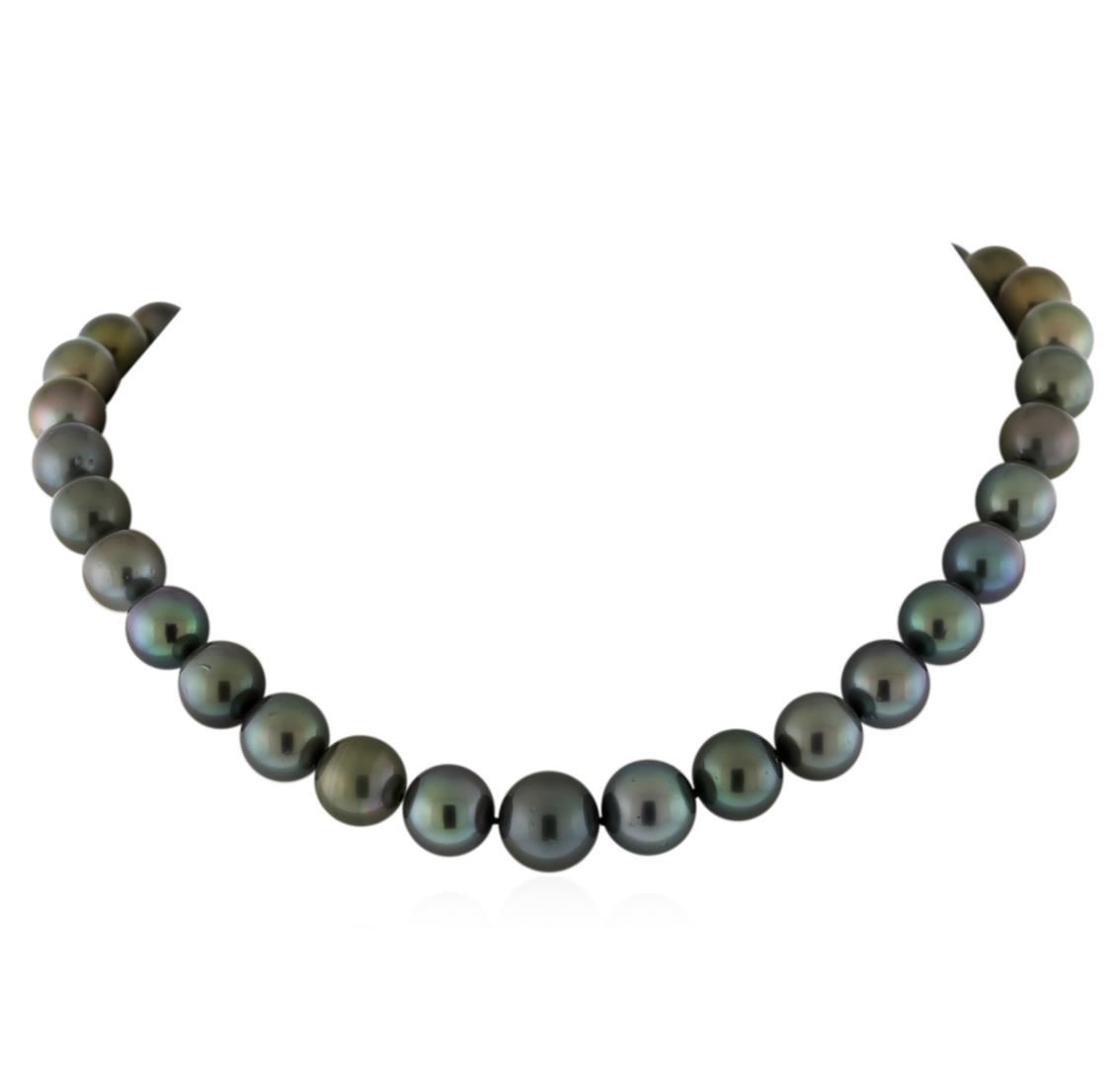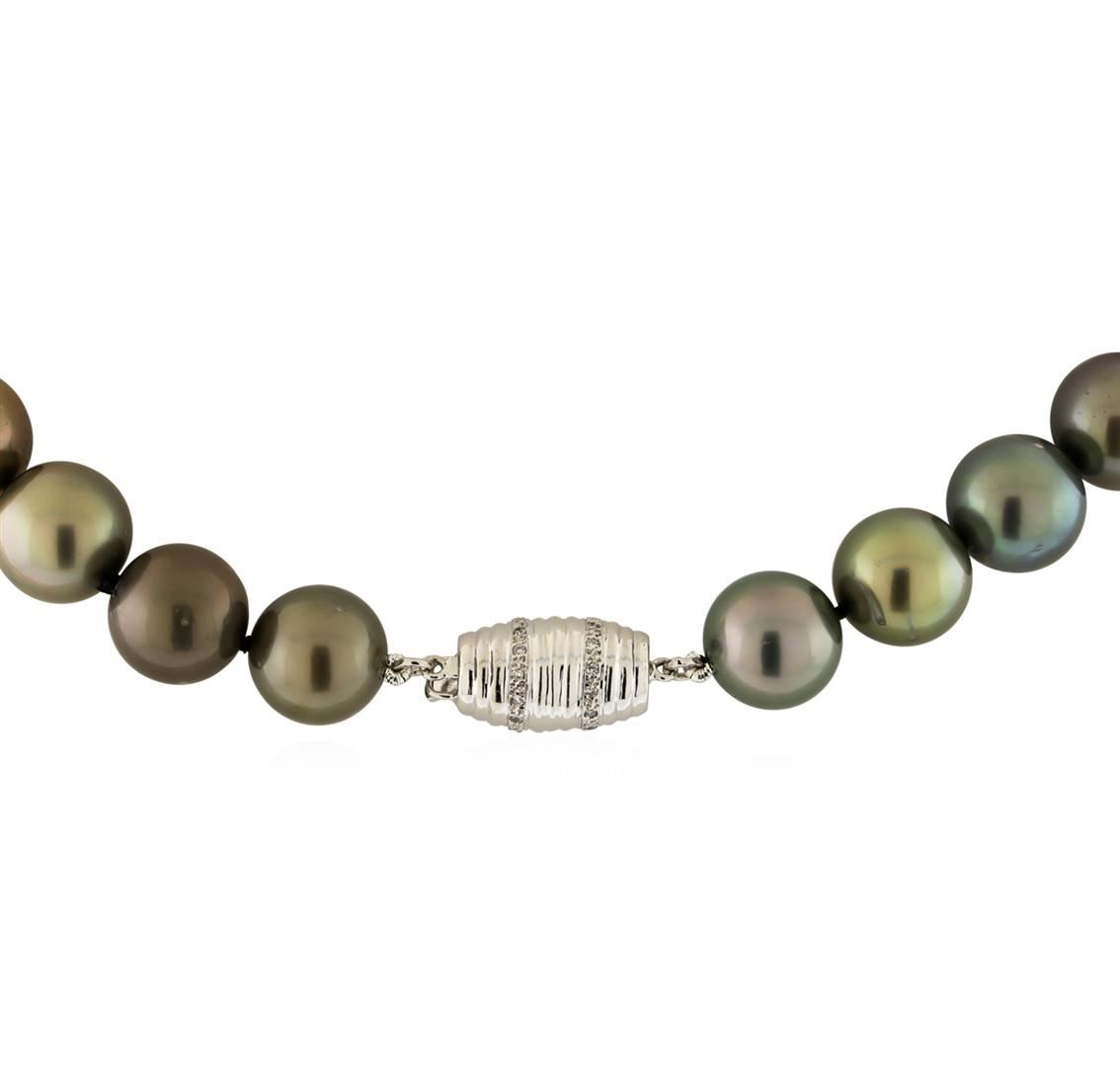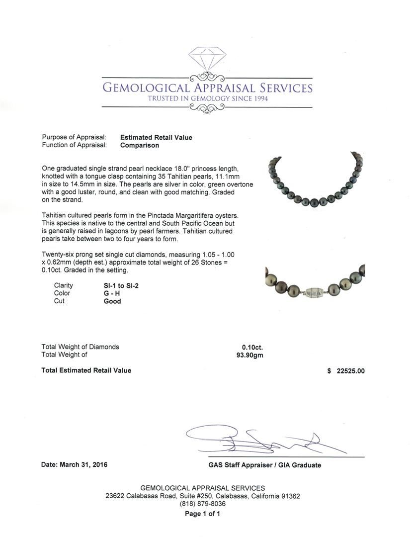 One graduated single strand pearl necklace 18.0" princess length, knotted with a tongue clasp containing 35 Tahitian pearls, 11.1mm in size to 14.5mm in size. The pearls are silver in color, green overtone with a good luster, round, and clean with good matching. Graded on the strand. Tahitian cultured pearls form in the Pinctada Margaritifera oysters. This species is native to the central and South Pacific Ocean but is generally raised in lagoons by pearl farmers. Tahitian cultured pearls take between two to four years to form. Twenty-Six prong set single cut diamonds, measuring 1.05 - 1.00 x 0.62mm (depth est.) approximate total weight of 26 Stones = 0.10ct. Graded in the setting. Clarity: SI-1 to SI-2. Color: G - Good. Total Weight of Diamonds 0.10ct. Total Weight of 93.90gm GAS Appraised at $22,525.00.