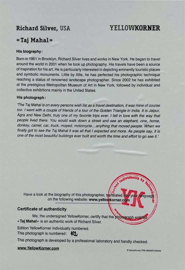Taj Mahal Certified Photograph, Richard Silver YellowKorner Certified Photograph. Certificate of Authenticity from YellowKorner affixed to the back. Matted Dimensions 16"x20". Protected with Clear Mylar Sleeve.