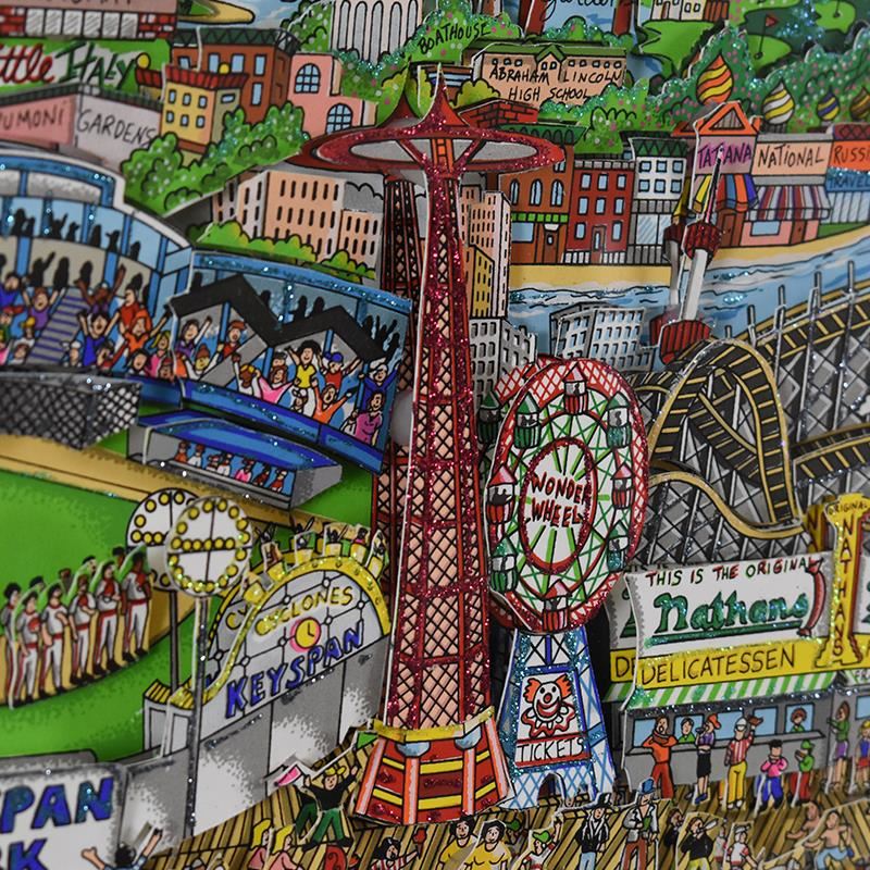 "Take the B-Train to Brooklyn" is a 3D limited edition silk screen construct on paper by Charles Fazzino numbered and hand signed by the artist. This piece comes custom framed. Includes Certificate of Authenticity. Measures approximately 21.5" x 27" (frame) 12.5" x 18" (image).
