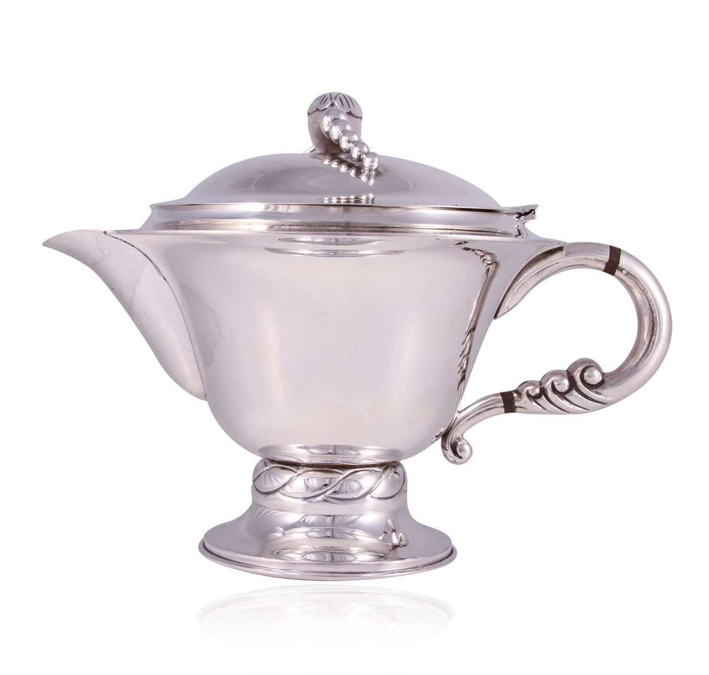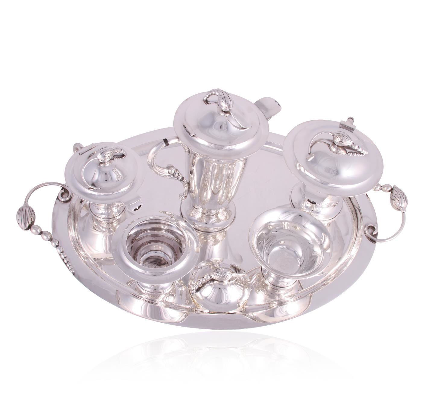 Tango aceves coffee and tea service, Mexico, c. 1965 | STERLING SILVER, Blossom Set includes teapot, coffee pot, sugar bowl with lid, creamer, waste bowl and tray. Signed with impressed manufacturers marks to each element: Aceves Sterling 925 Mexico San Francisco with touch marks. Tray weighs 2483 grams and measures 27" x 17.25", coffee pot weighs 1096 grams and measures 10.5" x 8.5", teapot weighs 984 grams and measures 7"x 8", creamer weighs 562 grams and measures 6" x 7", sugar bowl with lid weighs 474 grams and measures 6" x 5", waste bowl weighs 231 grams and measures 3.5" x 4.25". CONDITION: Excellent Vintage condition, small scratches due to light use on tray. One small ding to tray. Valued between $18,000-$20,000.