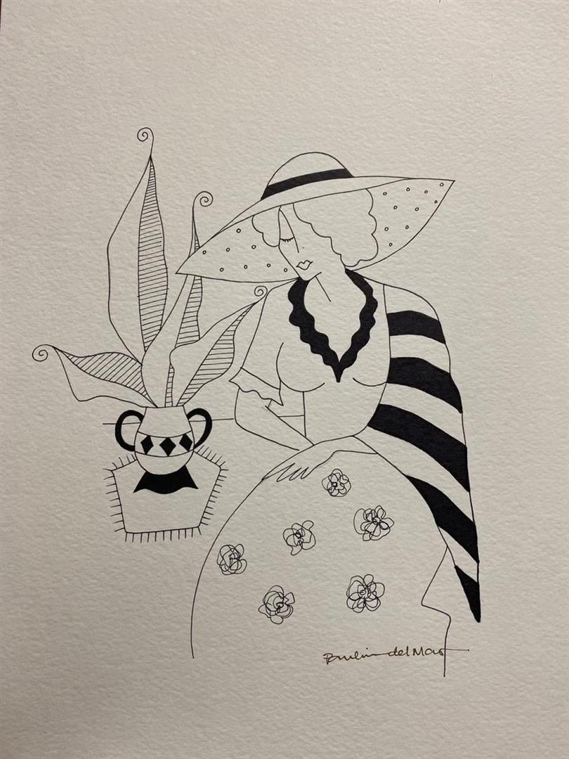 Tarkay Lady 15 by Del Mar, Paulina. Original One-of-a-Kind Hand Signed Pen and Ink. Dimensions: 15 x 11. Excellent Condition.