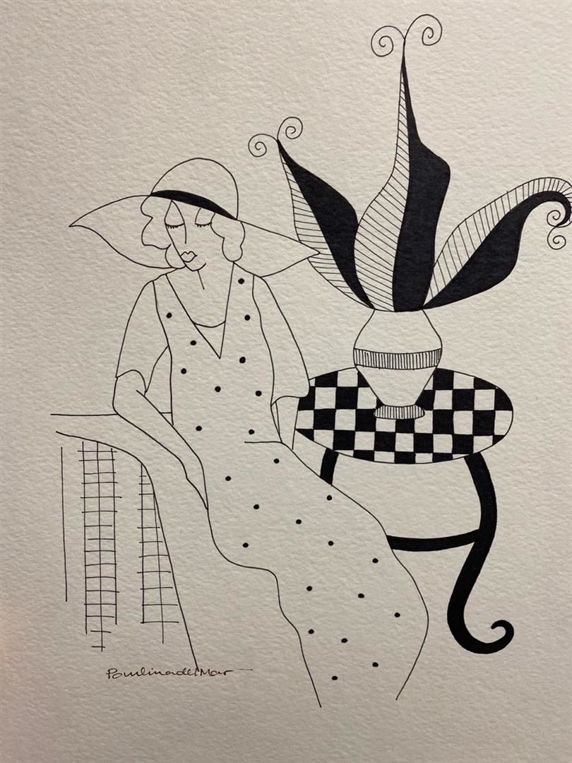 Tarkay Lady 7 by Del Mar, Paulina. Original One-of-a-Kind Hand Signed Pen and Ink. Dimensions: 15 x 11. Excellent Condition.