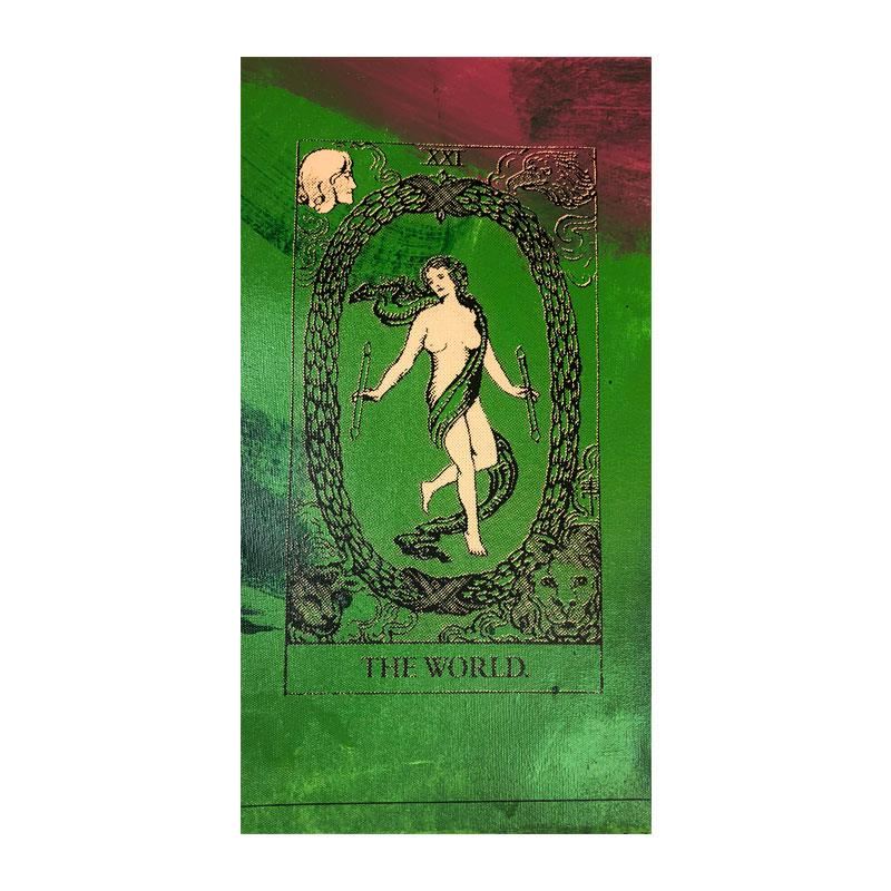 Tarot, The World is a limited edition hand pulled silkscreen mixed media on canvas by Andy Warhol protege Steve Kaufman (1960-2010). This piece is numbered and 4/50 and hand signed inverso. Includes letter of authenticity. As is common with Kaufman's works, this piece may have perceived minor flaws, but is in overall good condition. Measures approximately 18" x 10" (image).