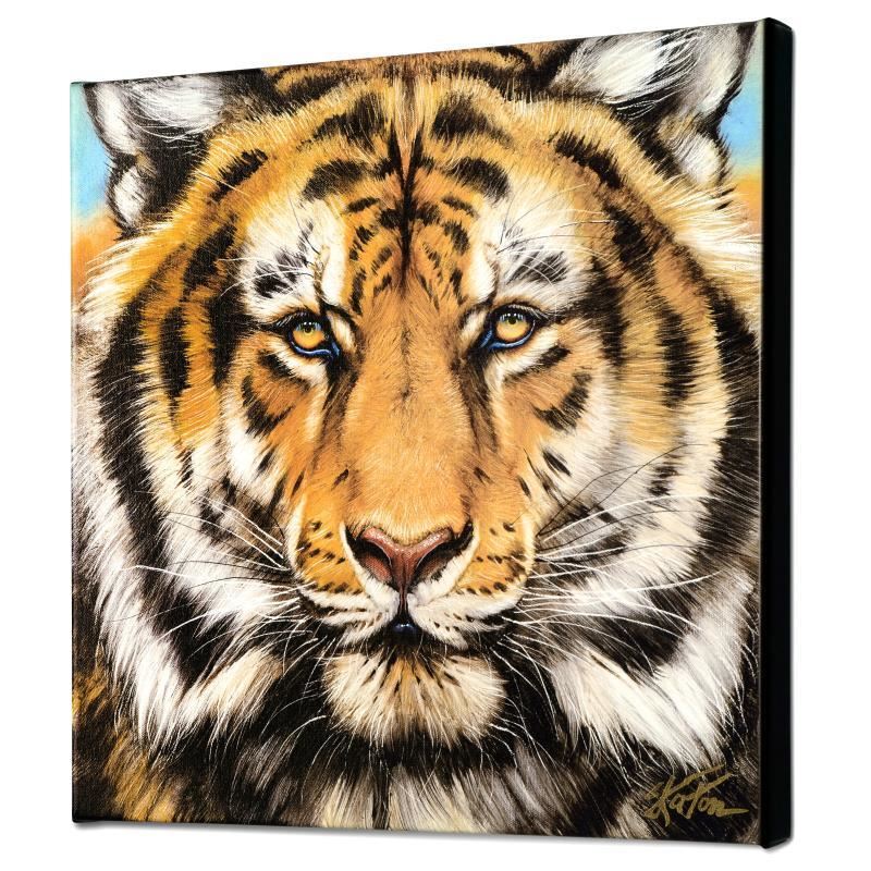 "Terrific Tiger" is a limited edition giclee on canvas by Martin Katon, numbered and hand signed by the artist! This piece comes gallery wrapped. Includes Letter of Authenticity. Measures approx. 16" x 16" (image).