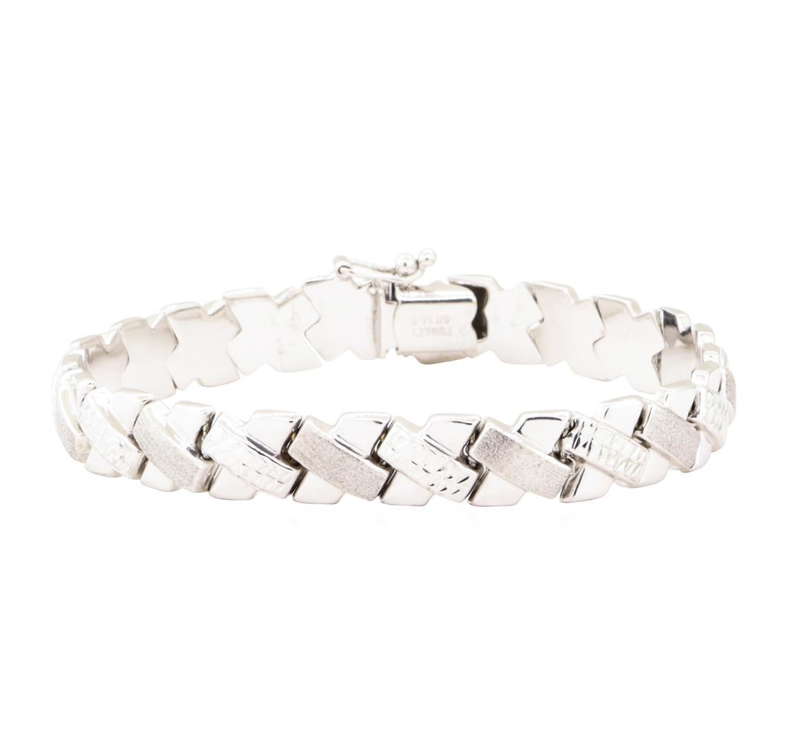 One textured "X" motif bracelet measuring approximately seven inches in length and 8mm in width featuring: 14KT white gold weighing 10.1 grams.
