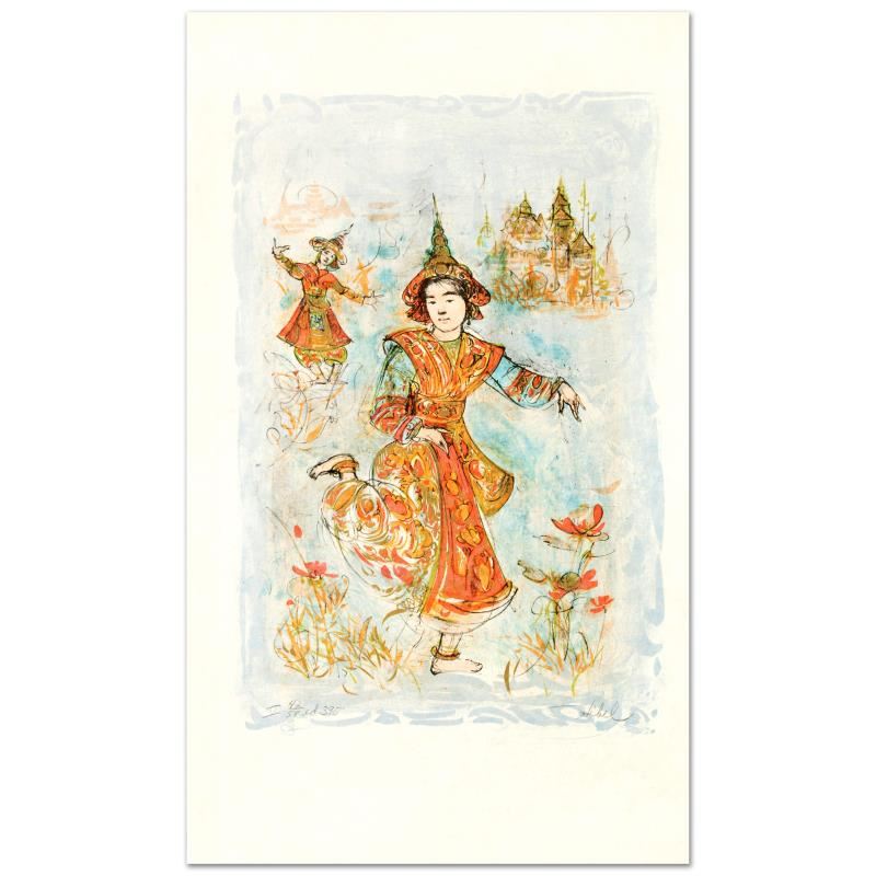 "Thai Dancers" is a limited edition lithograph on rice paper, numbered and hand signed by Edna Hibel (1917-2014). Includes Certificate of Authenticity! Measures approx. 15" x 25" (with border), 12" x 18.5" (image).