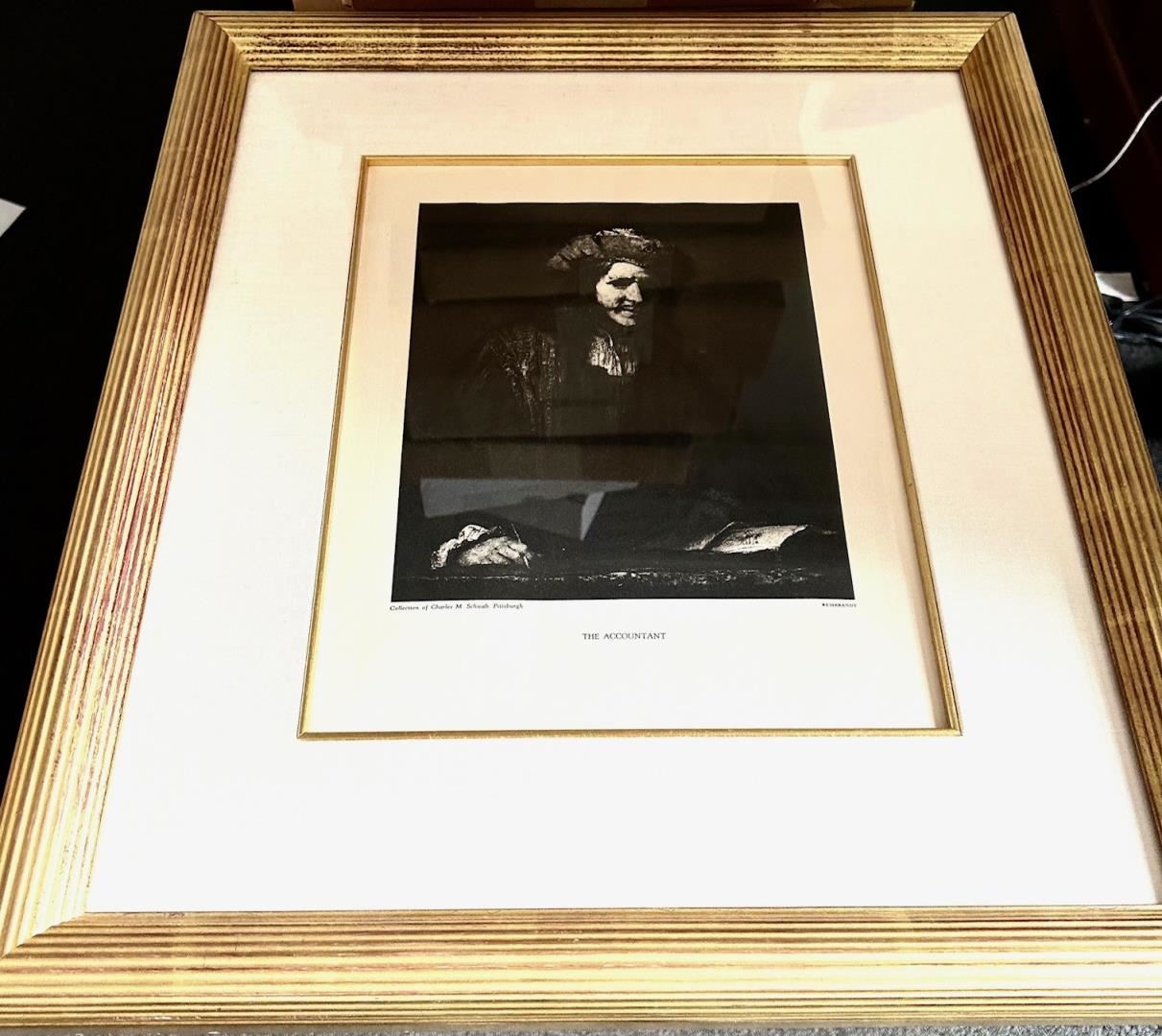 An 11x14" Rembrandt etching of The Accountant , from a modern bookplate , Framed with linen matt and gold filet 19.5x22.5.