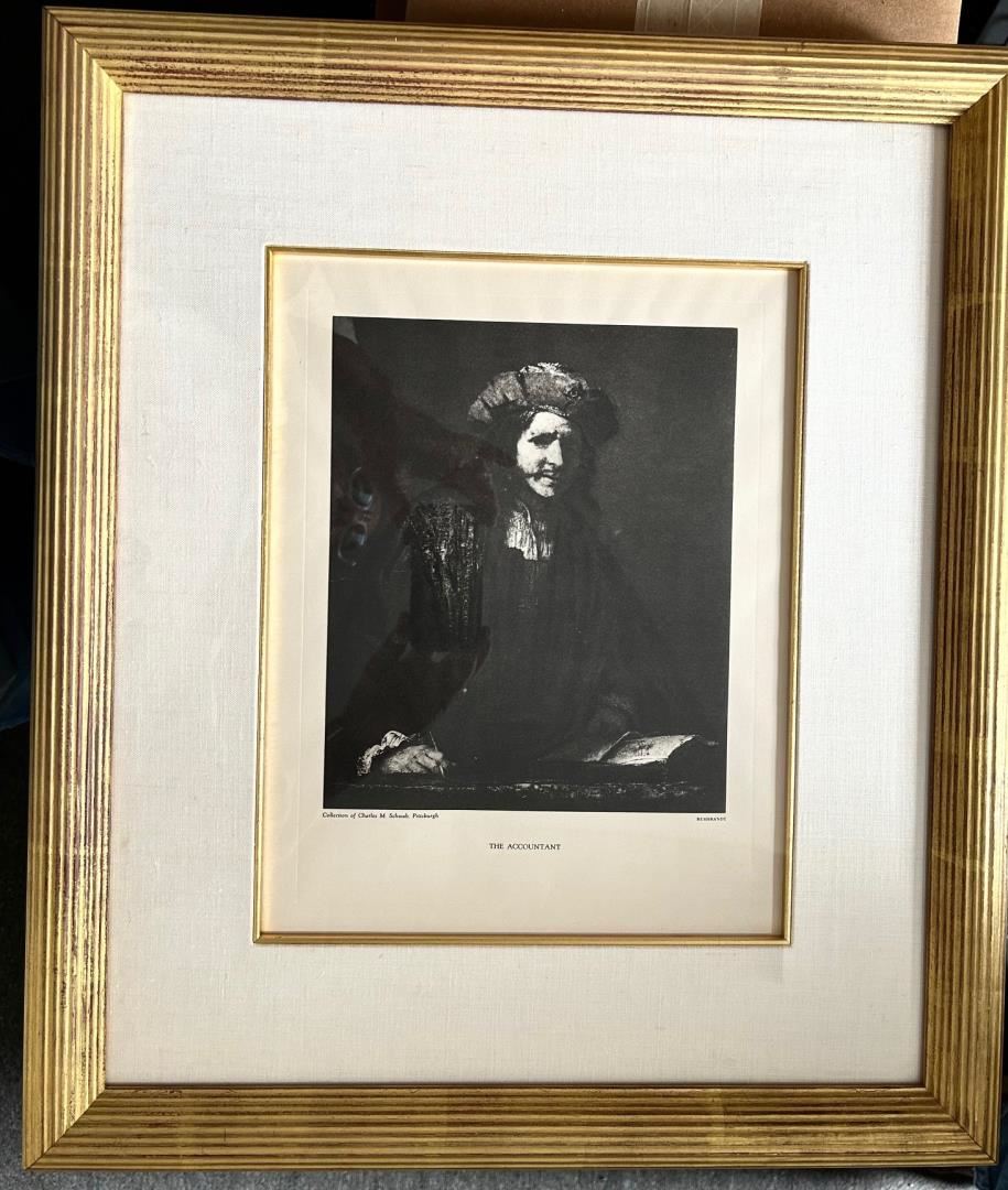 An 11x14" Rembrandt etching of The Accountant , from a modern bookplate , Framed with linen matt and gold filet 19.5x22.5.