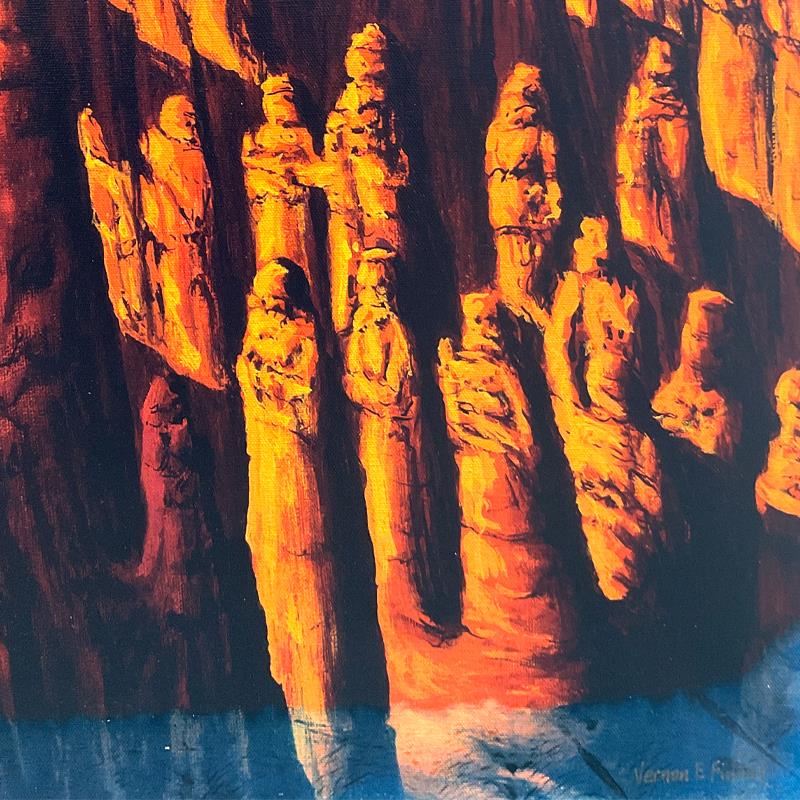 "The Choir" is a limited edition giclee on stretched canvas by Vernon Finney, numbered 3/295 and hand signed by the artist. Includes Letter of Authenticity. Measures approx. 35" x 30" (image). There is some fading along the bottom of the canvas, and a blue spot on the top-left part of the sky. There is also a faint crease running around the perimeter of the image where the canvas meets the stretch bars.