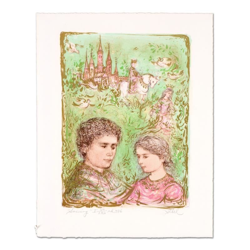 "The Family Suite Edition I" is a 4-piece set of limited edition lithographs on paper celebrating the beauty of family in all of its four stages: "Sowing - The Promise", "Ripening - The Fulfillment", "Harvesting - The Future", and "Through the Generations". Each piece is numbered and hand signed by Edna Hibel (1917-2014). Includes Certificate of Authenticity. Measures approx. 14" x 18" (box); 12" x 16" (each lithograph).