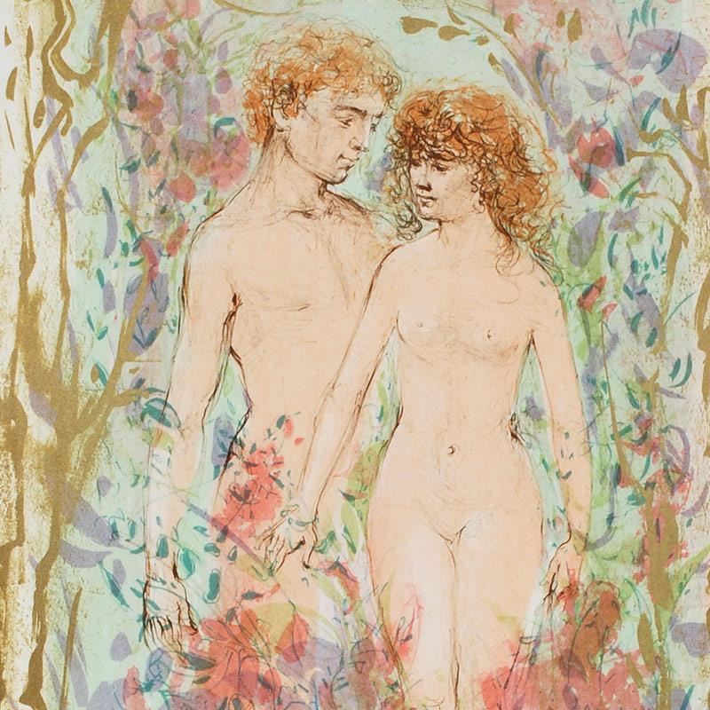 "The First Couple" is a limited edition lithograph on paper, numbered and hand signed by Edna Hibel (1917-2014). Includes Certificate of Authenticity! Measures approx. 18" x 22" (with border), 12" x 16" (image).