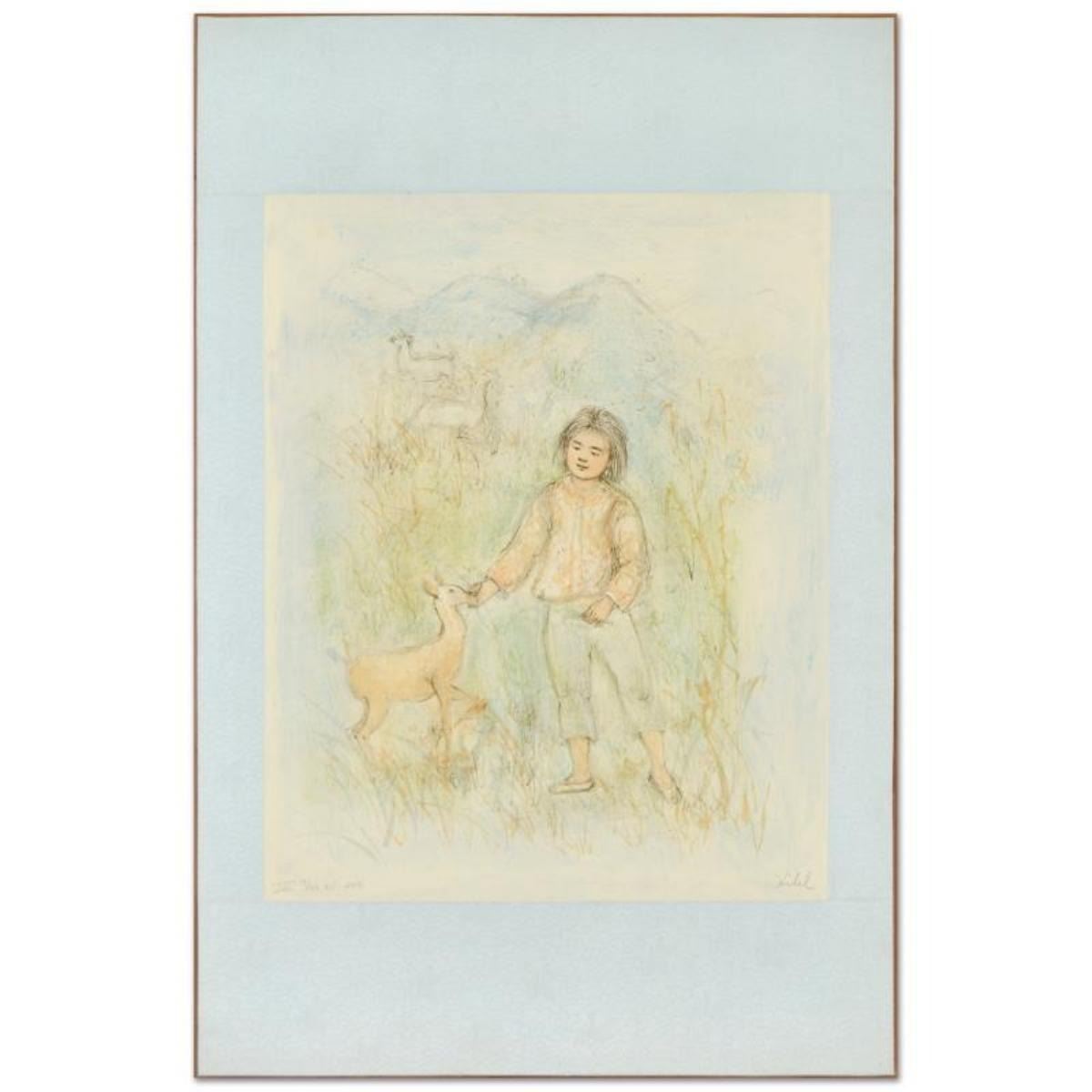 "The Forest Friend" is a limited edition lithograph on japon paper, numbered and hand signed by Edna Hibel (1917-2014). Includes Certificate of Authenticity! Measures approx. 20" x 29.5" (with border), 16" x 20" (image).