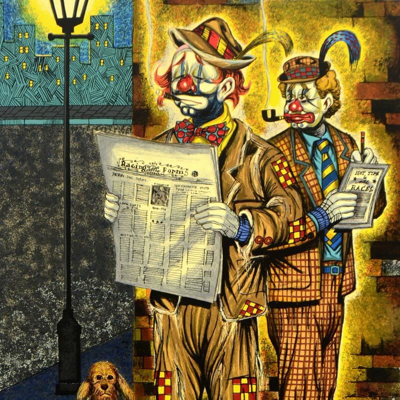 "The Gents" is a limited edition lithograph on paper by George Crionas (1925-2004), numbered and hand signed by the artist. Includes Letter of Authenticity. Measures approx. 25.5" x 37" (border), 21" x 31" (image). Due to the age of this piece there may be minor wear in the border area that may be concealed when framed.