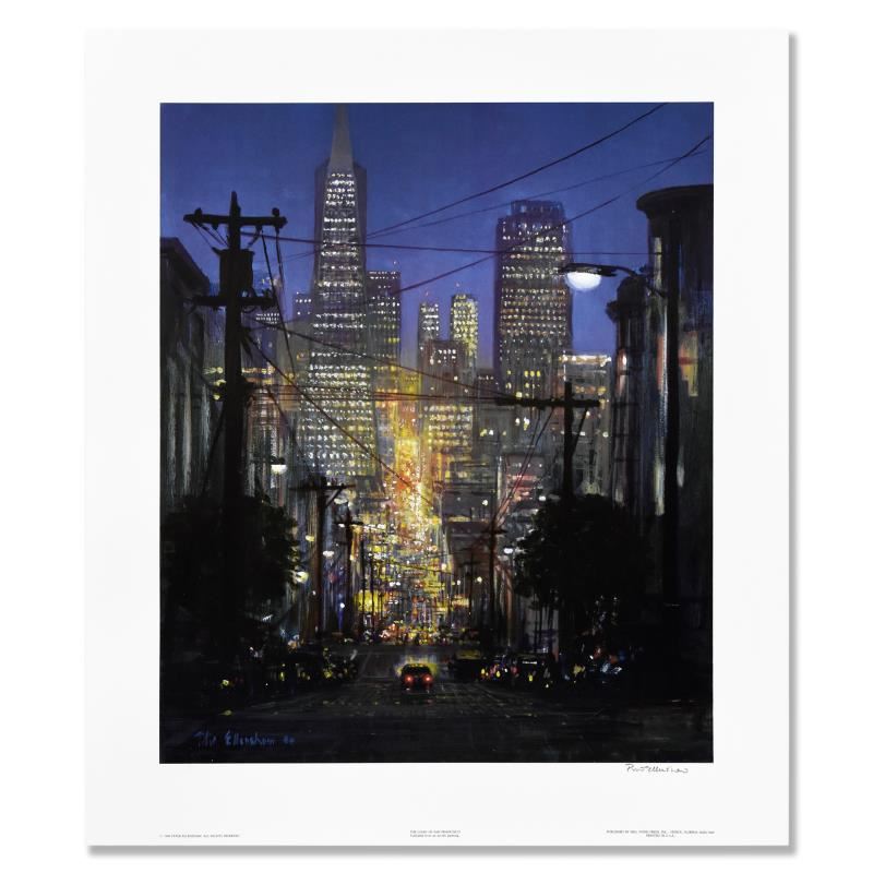 "The Glow of San Francisco" is a limited edition lithograph on paper by Peter Ellenshaw (1913-2007), numbered and hand signed by the artist. Includes Letter of Authenticity. Measures approx. 18.5" x 22" (border), 14.5" x 18" (image). Please note: due to the very thin nature of this paper, there may be some minor creases.