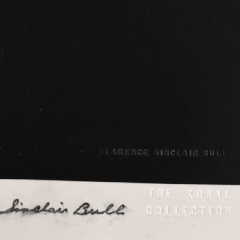 "The Kiss" is a limited edition photograph on paper by Clarence Sinclair Bull (1895-1979) numbered and stamp signed by the estate. This photograph is from the original negative. This piece bears inverso the Official Clarence Sinclair Bull Stamp and Includes Letter of Authenticity. Measures approx. 16" x 20" (image). Due to the age and improper storage of this piece the paper is wavy and there may be other imperfections such as smudging on the signature; the piece however is overall presentable.