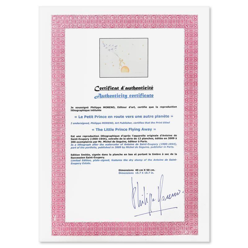 "The Little Prince Flying Away" is a limited edition lithograph by Antoine de Saint-Exupery (1900-1944) bearing the plate signature of the artist. This piece comes from an edition of 300 authorized by the Exupery Estate but the pieces in this edition are not individually numbered. This piece comes custom framed. Includes Certificate of Authenticity. Measures approx. 25.5" x 21.5" (frame) 19.5" x 15.5" (image).