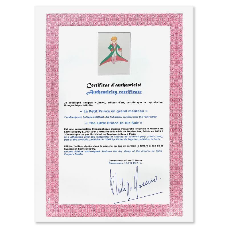 "The Little Prince In His Suit" is a limited edition lithograph by Antoine de Saint-Exupery (1900-1944), bearing the plate signature of the artist. This piece comes from an edition of 300 authorized by the Exupery Estate, but the pieces in this edition are not individually numbered. This piece comes custom framed. Includes Certificate of Authenticity. Measures approx. 21.5" x 25.5" (frame), 15.5" x 19.5" (image). This item requires special handling and may have a longer than usual turnaround.