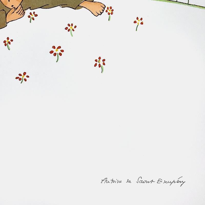 "The Little Prince Lying On The Grass" is a limited edition lithograph by Antoine de Saint-Exupery (1900-1944), bearing the plate signature of the artist. This piece comes from an edition of 300 authorized by the Exupery Estate, but the pieces in this edition are not individually numbered. Includes Certificate of Authenticity. Measures approx. 25.5" x 21.5" (frame), 19.5" x 15.5" (image).