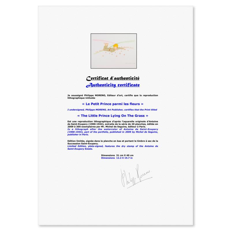 "The Little Prince Lying On The Grass" is a limited edition lithograph on paper by Antoine de Saint-Exupery 1900-1944 (After), bearing the plate signature of the artist.This piece comes from an edition of 300 authorized by the Exupery Estate, but the pieces in this edition are not individually numbered. This piece comes custom framed. Includes Certificate of Authenticity. Measures approx. 16" x 20" (frame) 12" x 16" (image). This item requires special handling and may have a longer than usual turnaround.