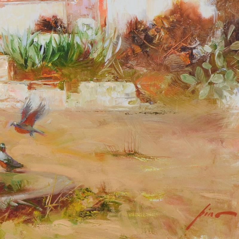 Pino's portraits allow glimpses into intensely personal, intimate spaces, conveying emotion through rich, warm color and sensual brushwork. "The Water Fountain" is a hand embellished limited edition giclee on canvas by Pino (1939-2010). The piece is numbered, hand signed, custom framed, and includes certificate of authenticity. Measures approx. 52" x 42" (frame), 40" x 30" (image). This item requires special handling and may have a longer than usual turnaround.