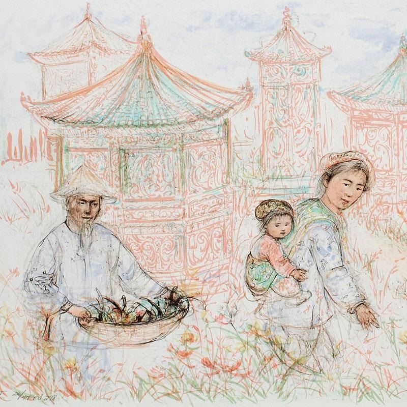 "Then and Now" is a limited edition lithograph on paper, numbered and hand signed by Edna Hibel (1917-2014). Includes Certificate of Authenticity! Measures approx. 16" x 20" (with border), 20" x 16" (image).