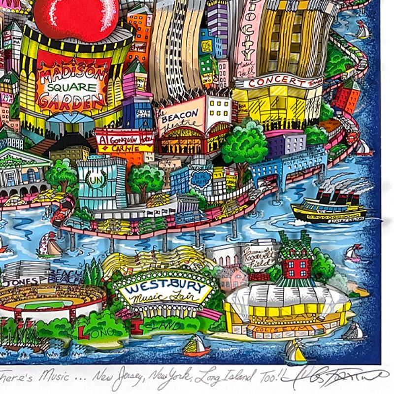 "There's Music: New Jersey, New York, Long Island Too!!" is a 3D limited edition silk screen construct on paper by Charles Fazzino, numbered and hand signed by the artist. This piece comes custom framed. Includes Certificate of Authenticity. Measures approximately 22" x 27" (framed), 15" x 20" (image).