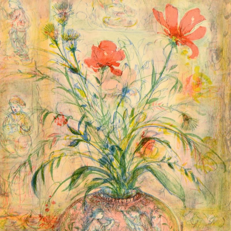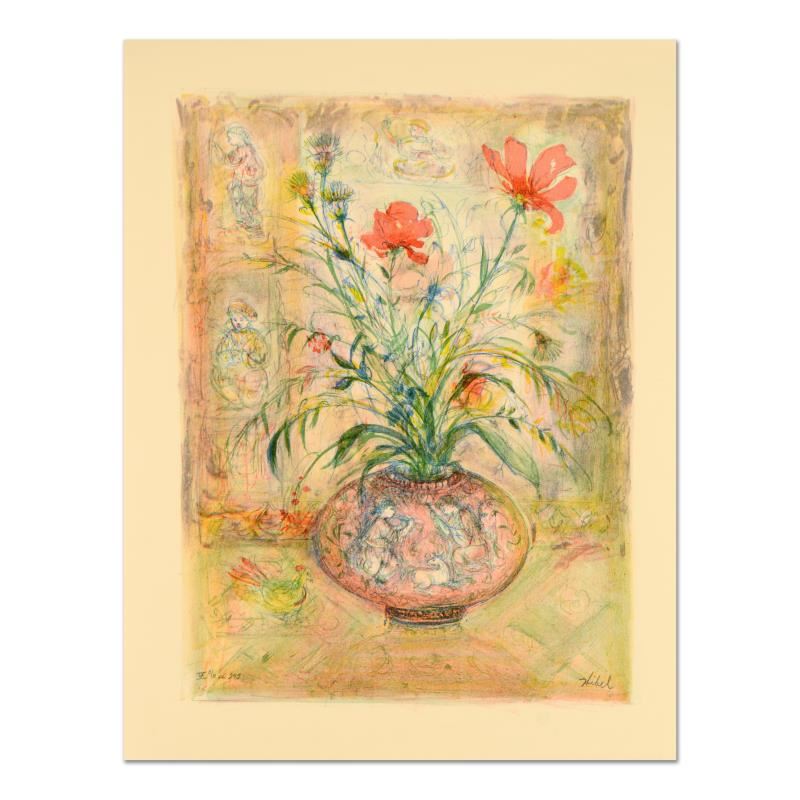 "Thistle Rose and a Day Lily" is a limited edition lithograph on paper by Edna Hibel (1917-2014), numbered and hand signed by the artist. Includes Certificate of Authenticity. Measures approx. 19.5" x 25.5" (border), 15.5" x 21.5" (image).