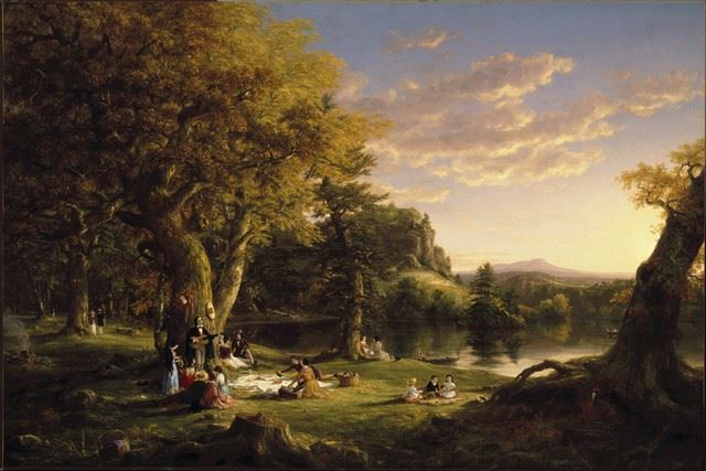 Artist: Thomas Cole - Title: The Picnic - Medium: Fine Art Giclee on Canvas - Image Size: Approximately 13.25 inches x 20 inches - Framed: Unframed on Unstretched Canvas - Biography: Thomas Cole (February 1, 1801 - February 11, 1848) was an English-born American painter known for his landscape and history paintings. One of the major 19th-century American painters, he is regarded as the founder of the Hudson River School,[1][2] an American art movement that flourished in the mid-19th century. Cole's work is known for its romantic portrayal of the American wilderness