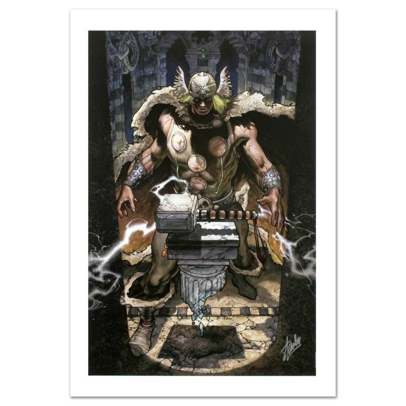 "Thor: For Asgard #6" is a limited edition giclee on canvas with art by Simone Bianchi. Officially licensed by Marvel, this piece is numbered 2/99 and hand signed by creative legend Stan Lee (1922-2018). The piece comes with a certificate of authenticity. Measures approximately 27" x 18".