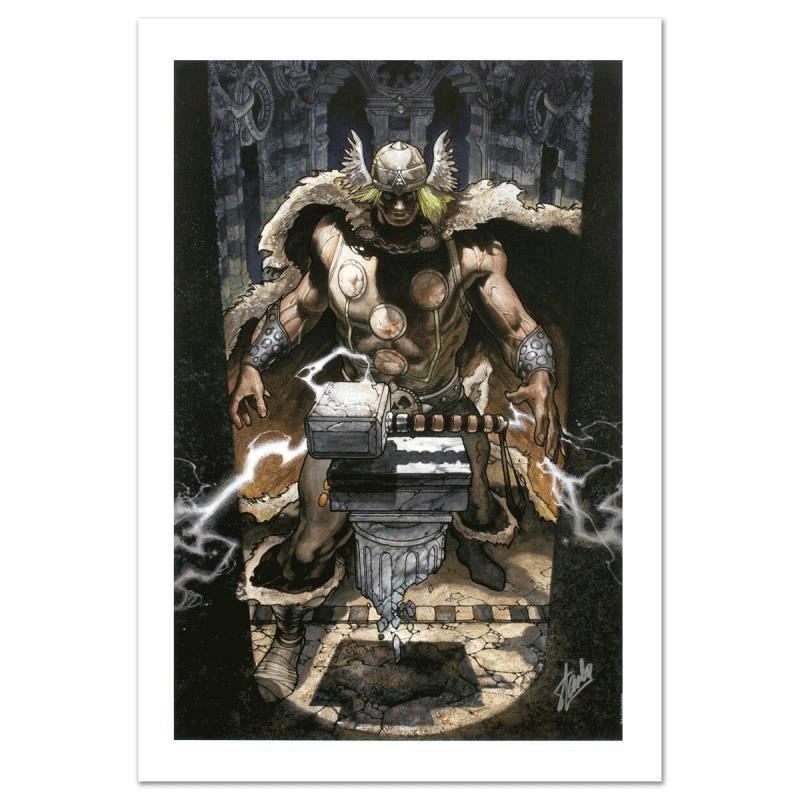 "Thor: For Asgard #6" is a limited edition giclee on canvas with art by Simone Bianchi. Officially licensed by Marvel, this piece is numbered 8/10 and hand signed by creative legend Stan Lee (1922-2018). The piece comes with a certificate of authenticity. Measures approximately 27" x 18".