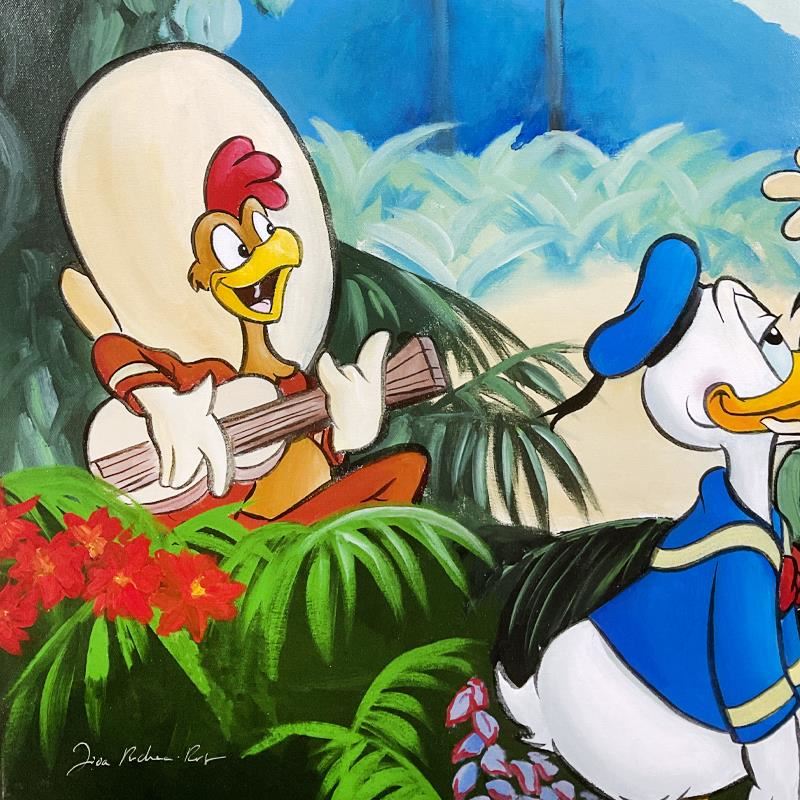 "Three Caballeros" is a limited edition giclee on canvas by Tricia Buchanan-Benson, numbered and hand signed by the artist. This piece is licensed by Disney Fine Art. Includes Letter of Authenticity. Measures approx. 30" x 40" (image).