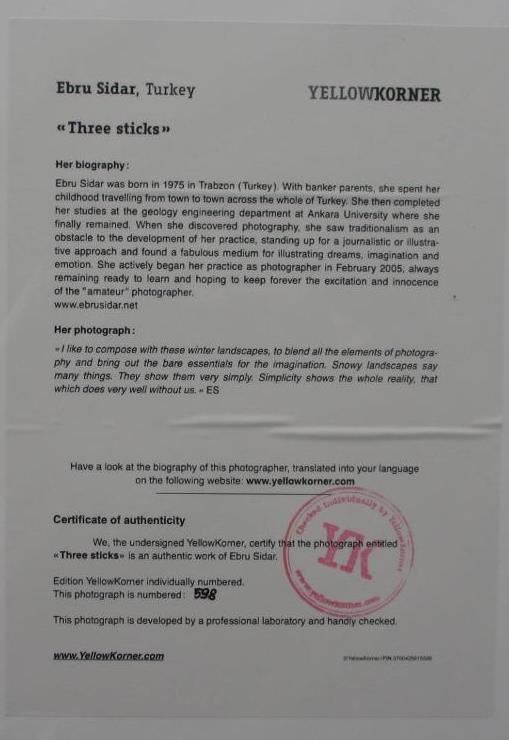 Three Sticks Certified Photograph, Ebru Sidar YellowKorner Certified Photograph. Certificate of Authenticity from YellowKorner affixed to the back. Matted Dimensions 16"x20". Protected with Clear Mylar Sleeve.