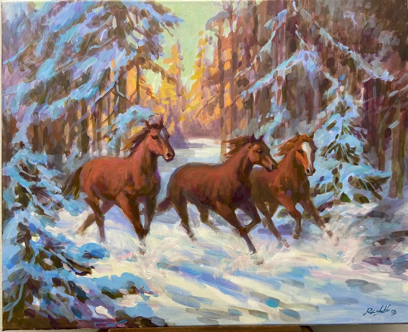 A 24x30" original acrylic on canvas, Three Yearlings by Richard Ho finds three young horses galloping in the snow.
