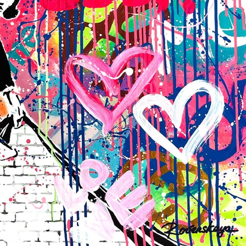"Throwing Some Paint" is a one-of-a-kind mixed media on deckle edge paper by Nastya Rovenskaya; hand signed by the artist. This piece comes custom framed and includes letter of authenticity. Measures approximately 28" x 36" (framed), 22" x 30" (image).