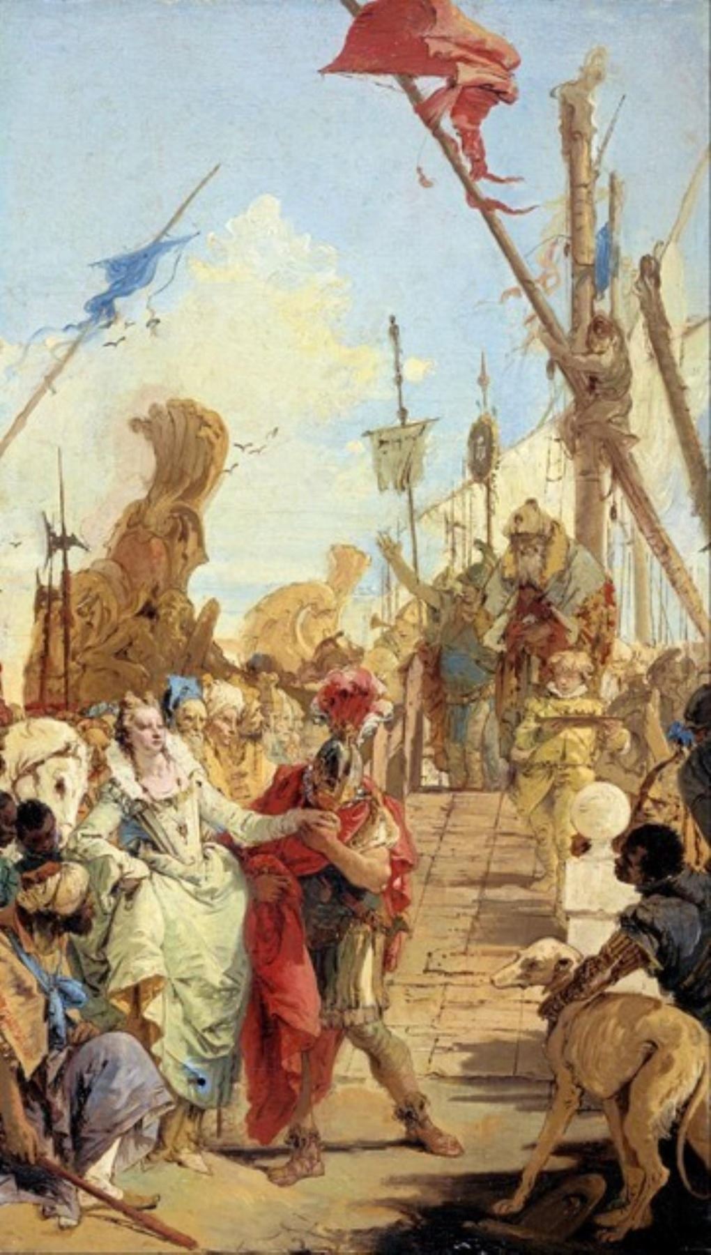 Artist: Tiepolo - Title: The Meeting of Anthony and Cleopatra - Medium: Fine Art Reproduction Giclee on Canvas - Image Size: Approximately 32 inches x 18 inches - Unframed on Unstretched Canvas - Biography: Giovanni Battista Tiepolo (March 5, 1696 - March 27, 1770), also known as Giambattista (or Gianbattista) Tiepolo, was an Italian painter and printmaker from the Republic of Venice who painted in the Rococo style, considered important member of the 18th-century Venetian school. He was prolific, and worked not only in Italy, but also in Germany and Spain.