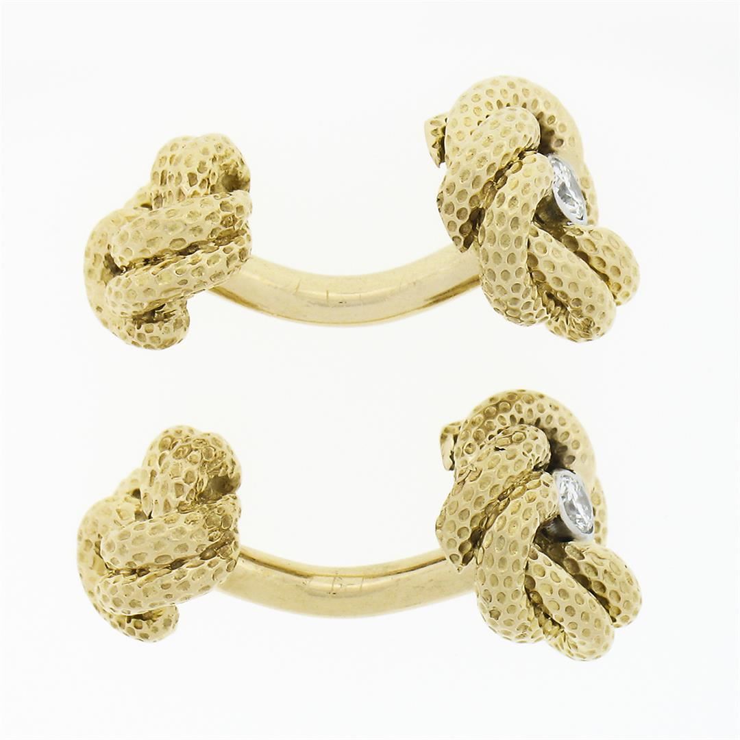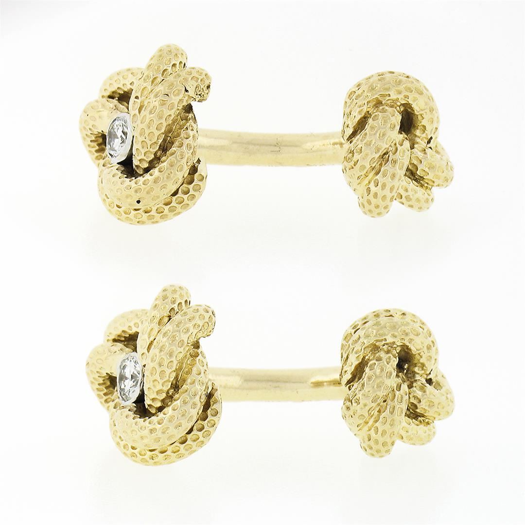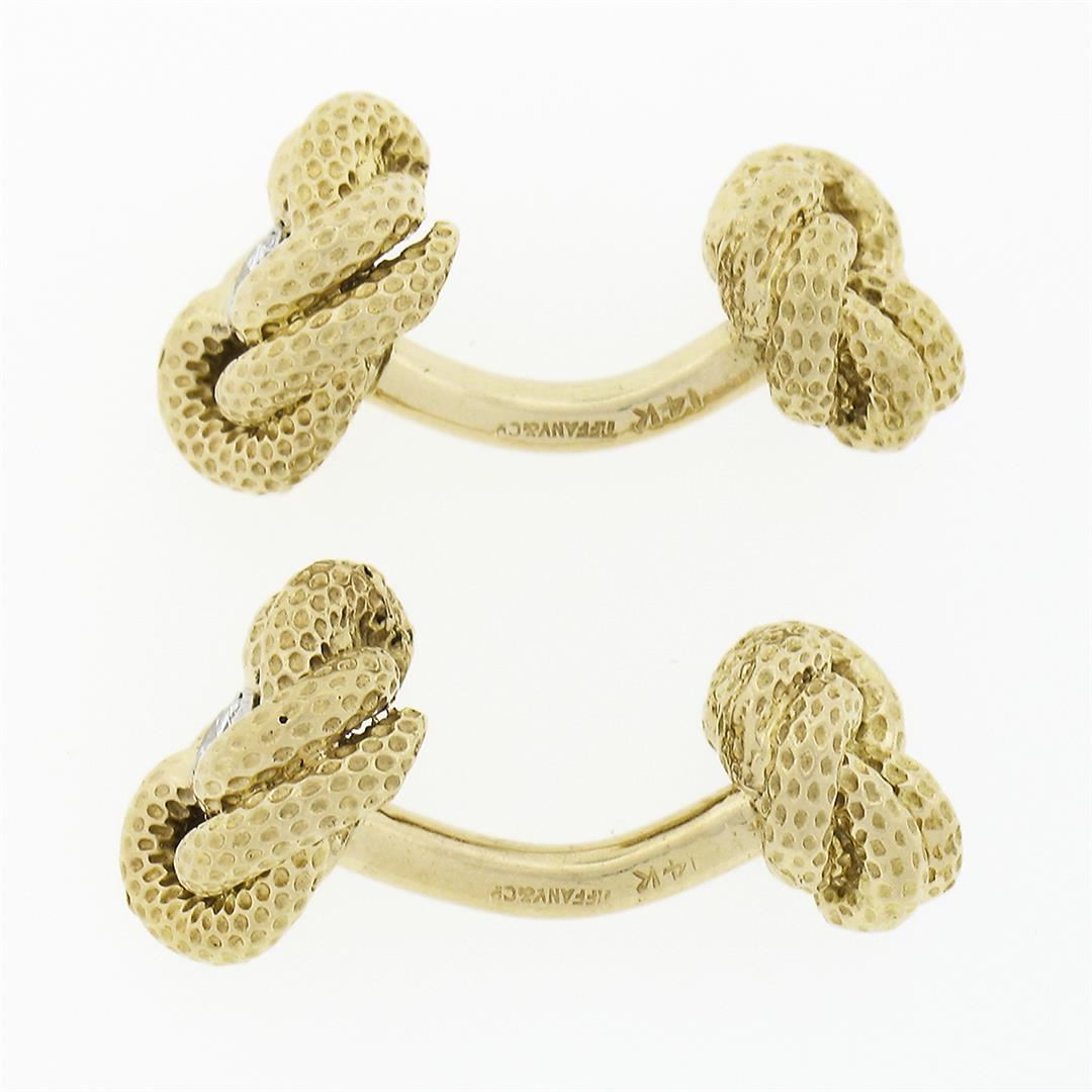 A solid 14k yellow gold love knot cufflinks by Tiffany & co., with 2 round brilliant cut natural diamonds (E/F - VVS2/VS1 ; 0.24ctw). These cuff links have a bar design with a clearance of 9.4mm, weigh a total of 17.68 grams, and the front panels measure 13.0x12.4mm.