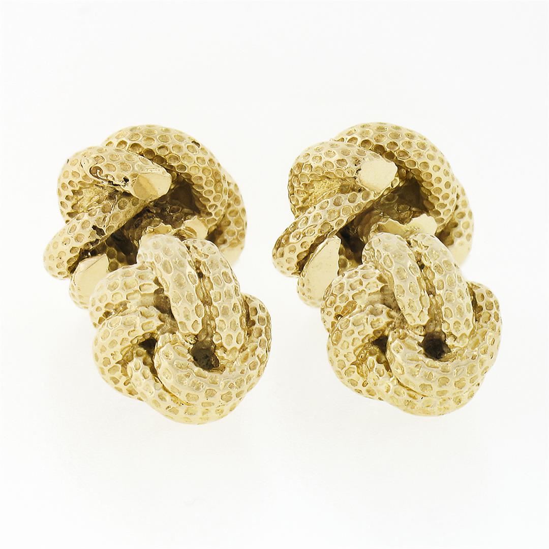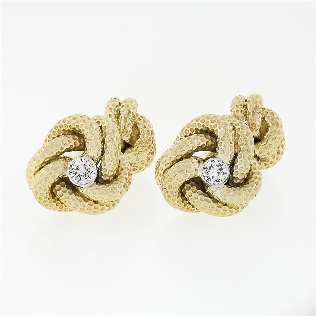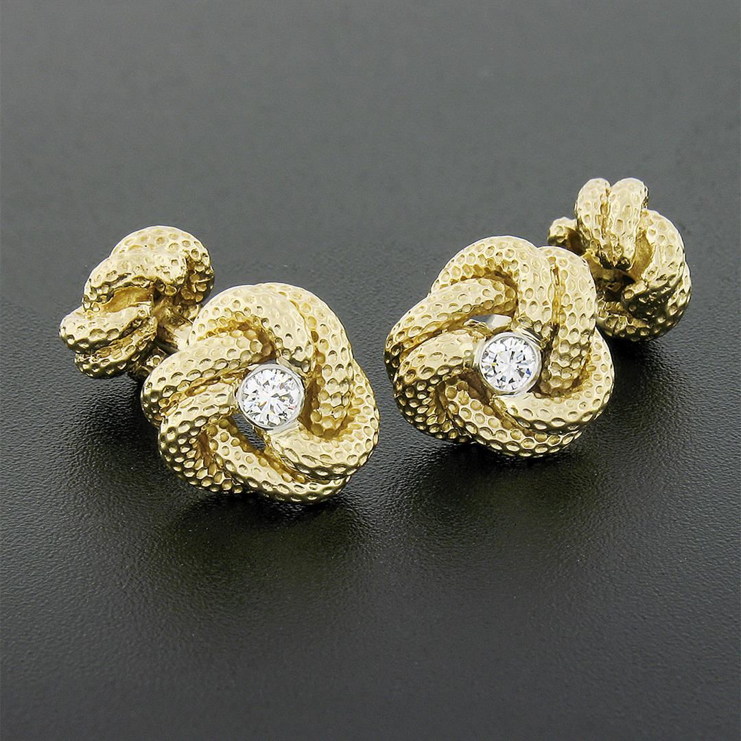 A solid 14k yellow gold love knot cufflinks by Tiffany & co., with 2 round brilliant cut natural diamonds (E/F - VVS2/VS1 ; 0.24ctw). These cuff links have a bar design with a clearance of 9.4mm, weigh a total of 17.68 grams, and the front panels measure 13.0x12.4mm.