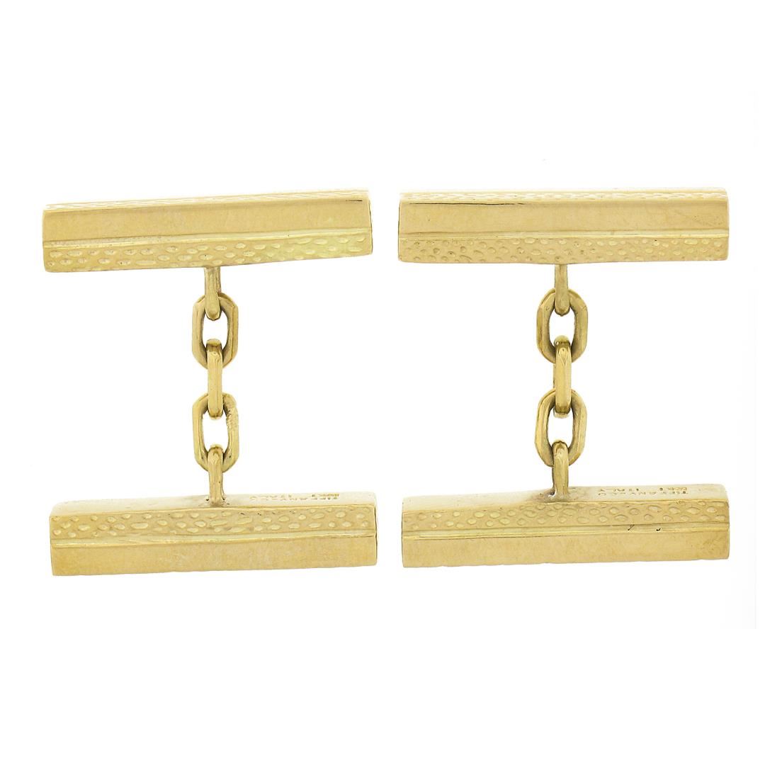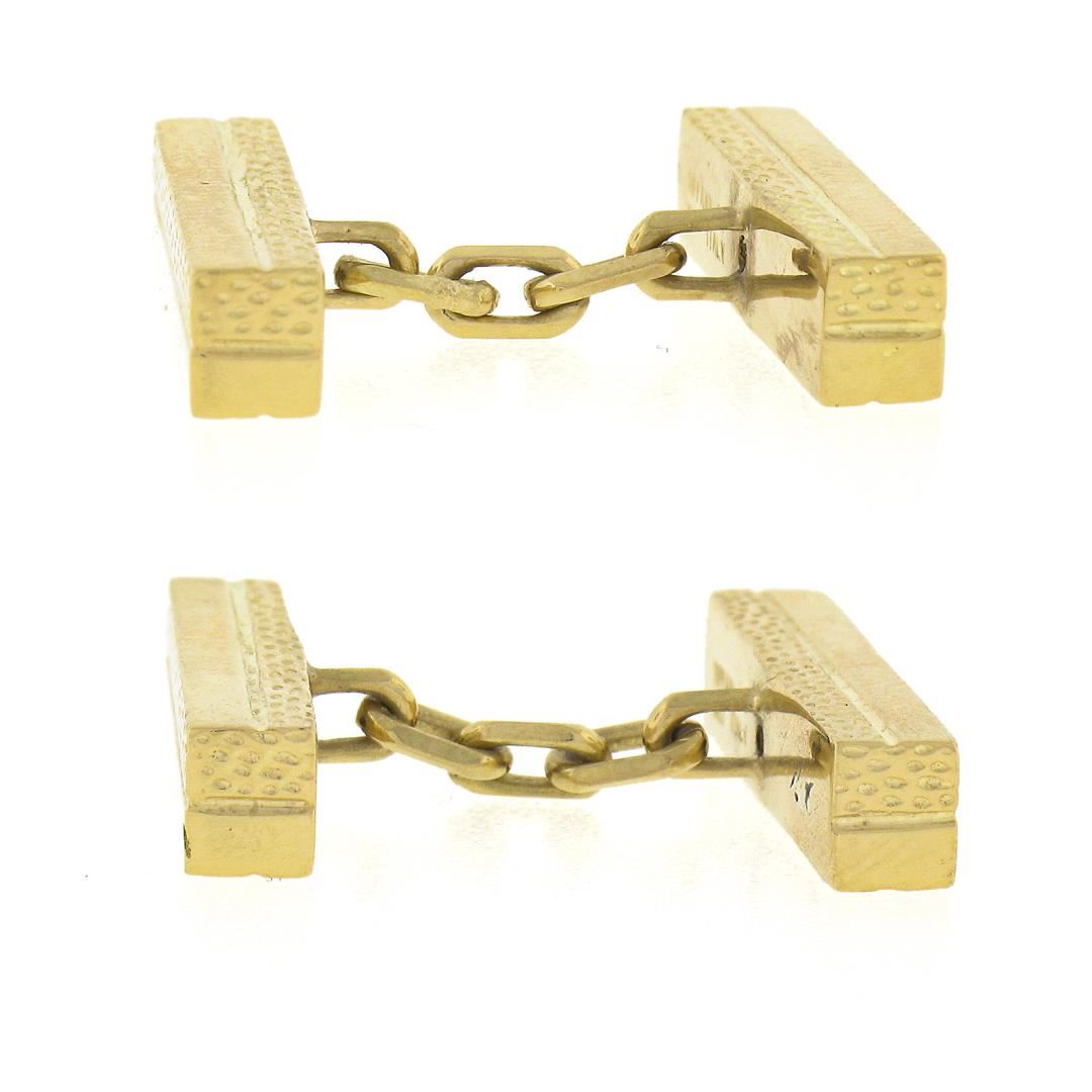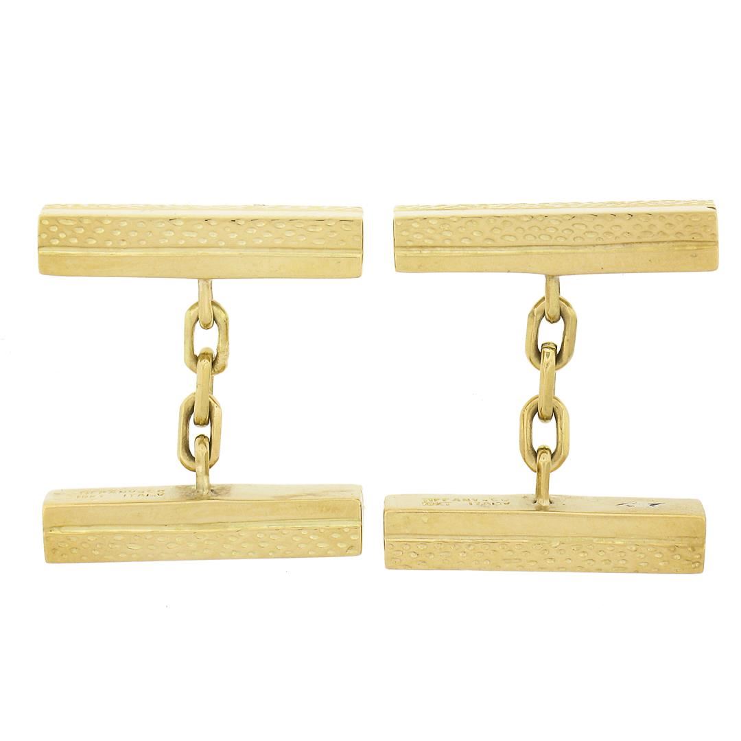 A solid 18k yellow gold geometric cufflinks by Tiffany & Co.These cuff links have a chain design with a clearance of 14.8mm, weigh a total of 12.85 grams, and the front panels measure 20.6x4.6mm.