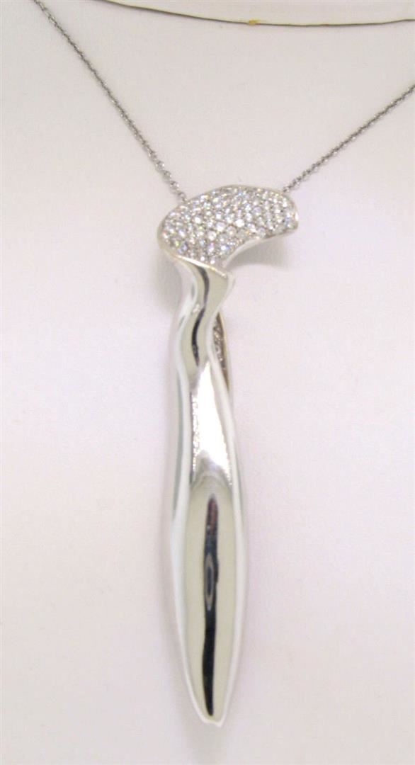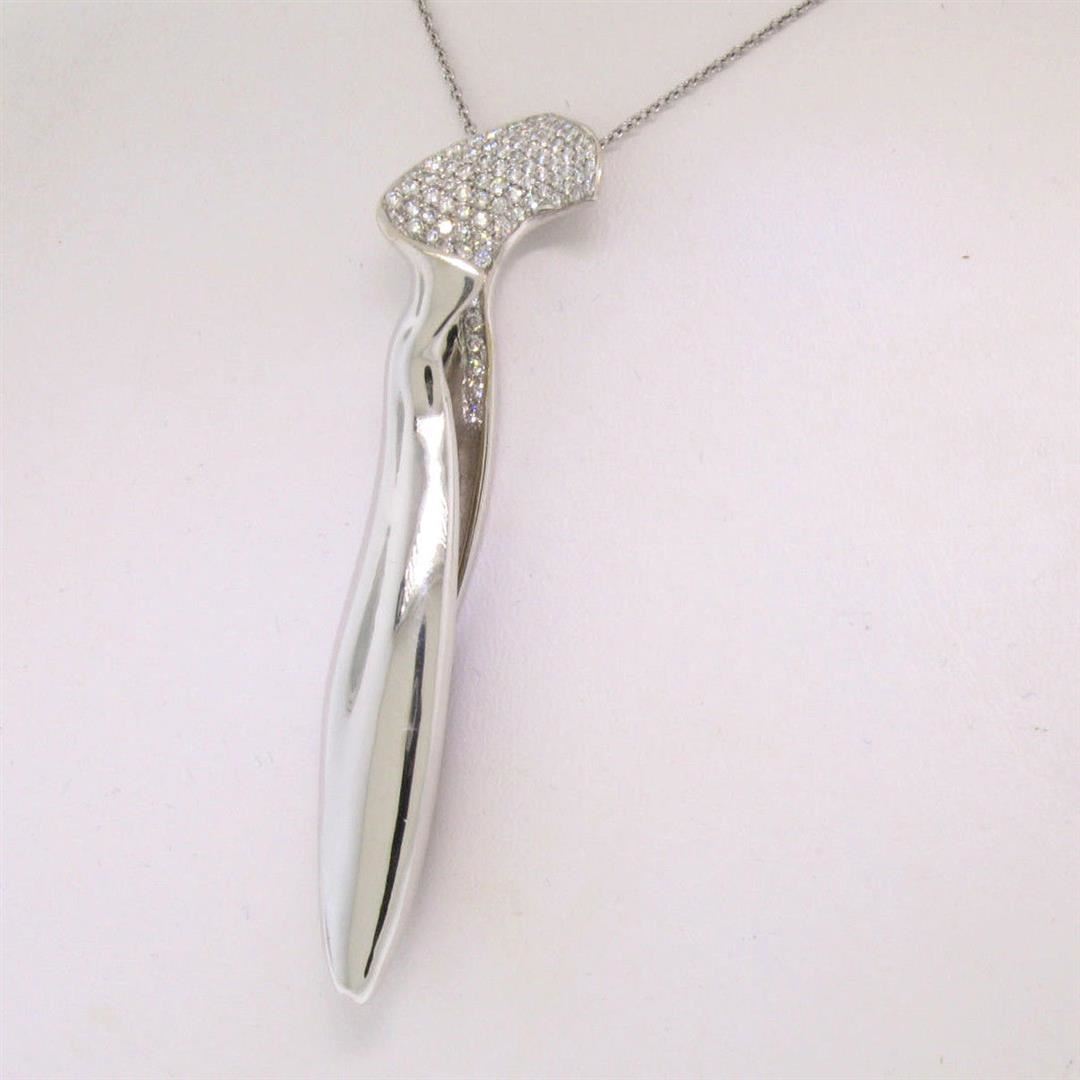 One Tiffany & Co. Frank Gehry 16" 18k White Gold Orchid Diamond Pendant Necklace. Item Details - Material: Solid 18k White Gold, Weight: 21.2 Grams, Stone(s): Natural Genuine Diamonds - Round Brilliant Cut - Micro-Pavé Set - VS1 Clarity - E Color, Total Carat Weight: 0.95 (approx.), Chain Type: Fine Cable Link, Chain Length: 16 Inches, Clasp: Spring Ring, Width: 10.92mm to 17.78mm (0.43" to 0.70"), Height: 68.58mm (2.7"), Signature (Pendant): Tiffany & Co. © Gehry 750, Signature (Chain): Tiffany & Co. / © Gehry 750, Condition: Has some minor surface wear to original finish and has not been refinished. 100% authentic, 100% all original, and comes with its original outer box.