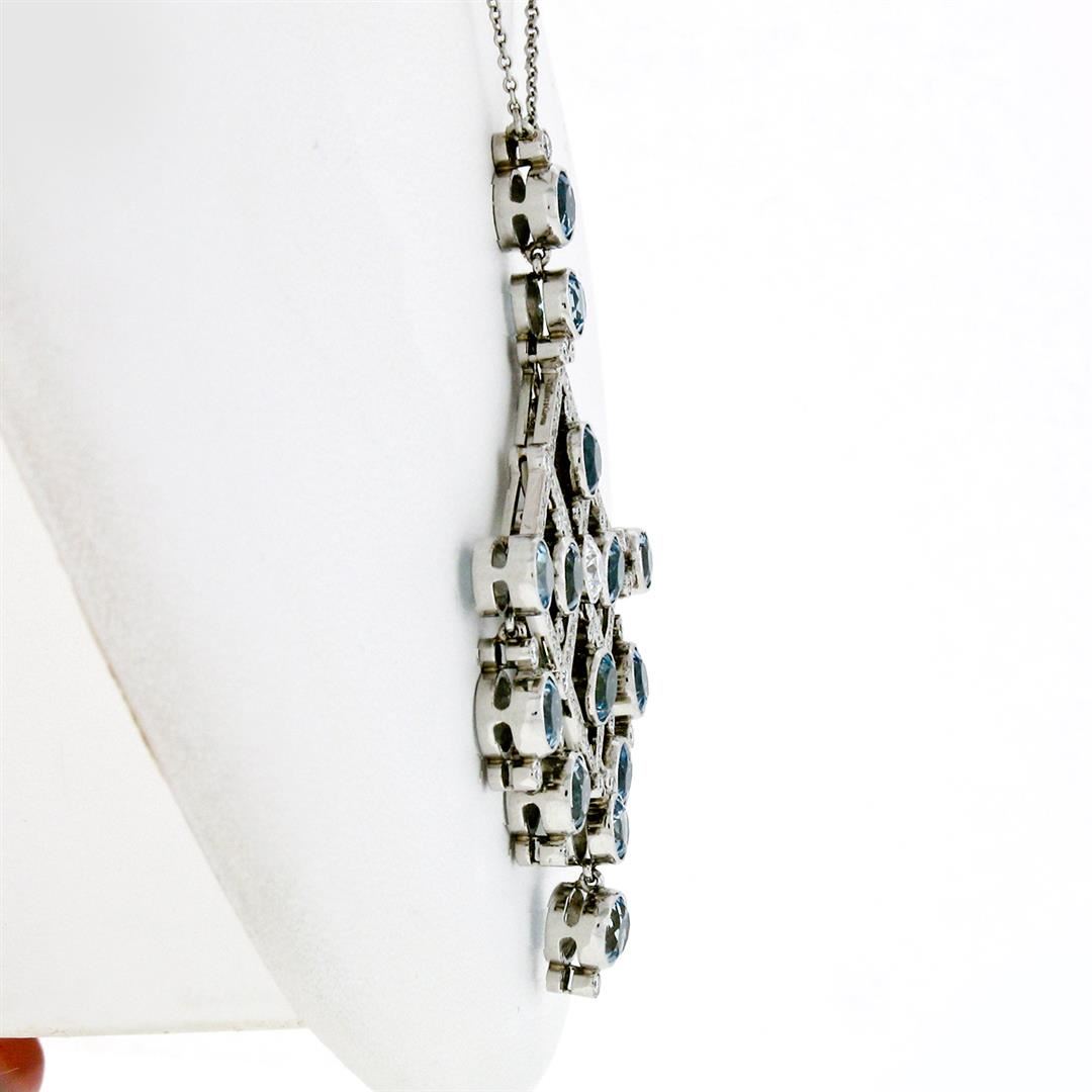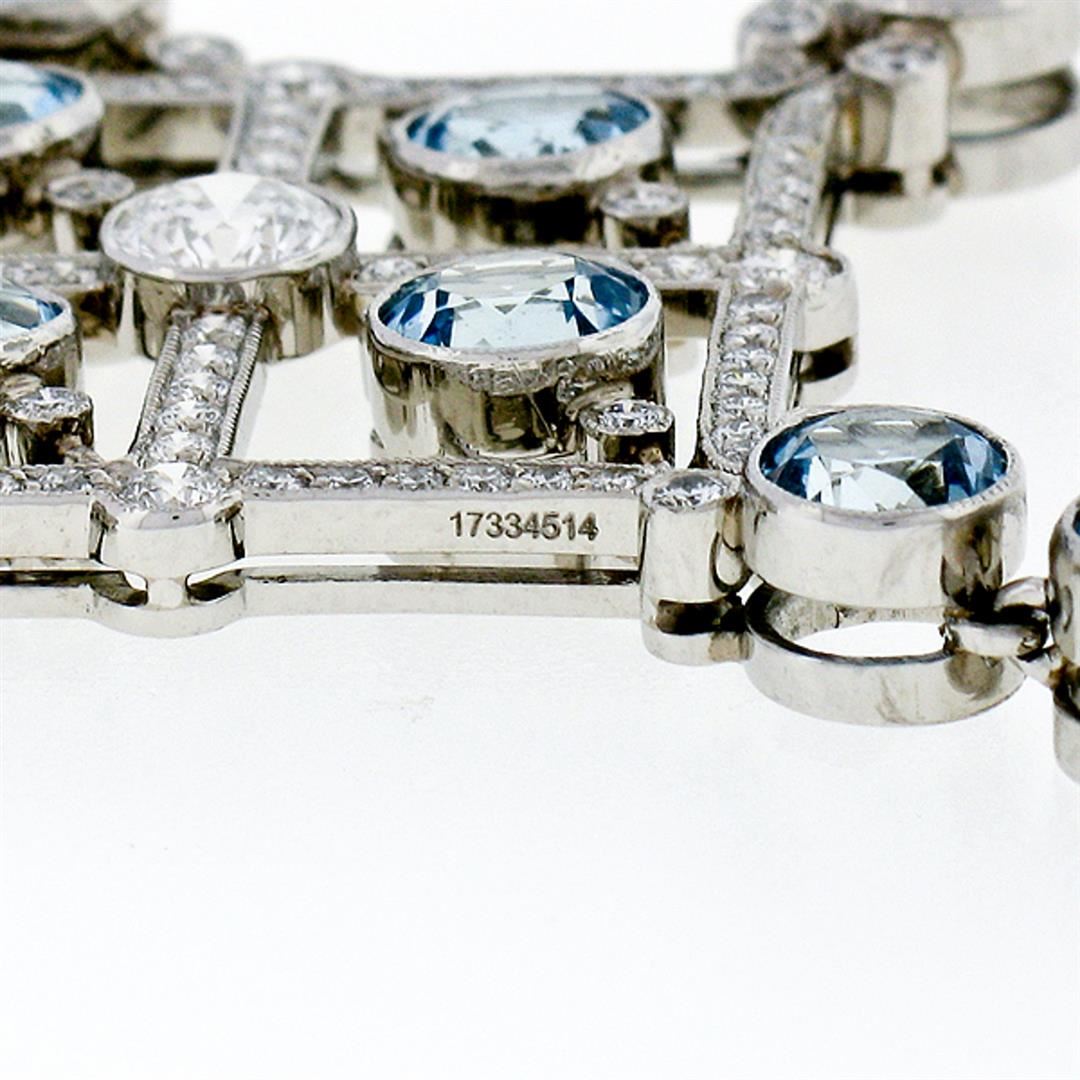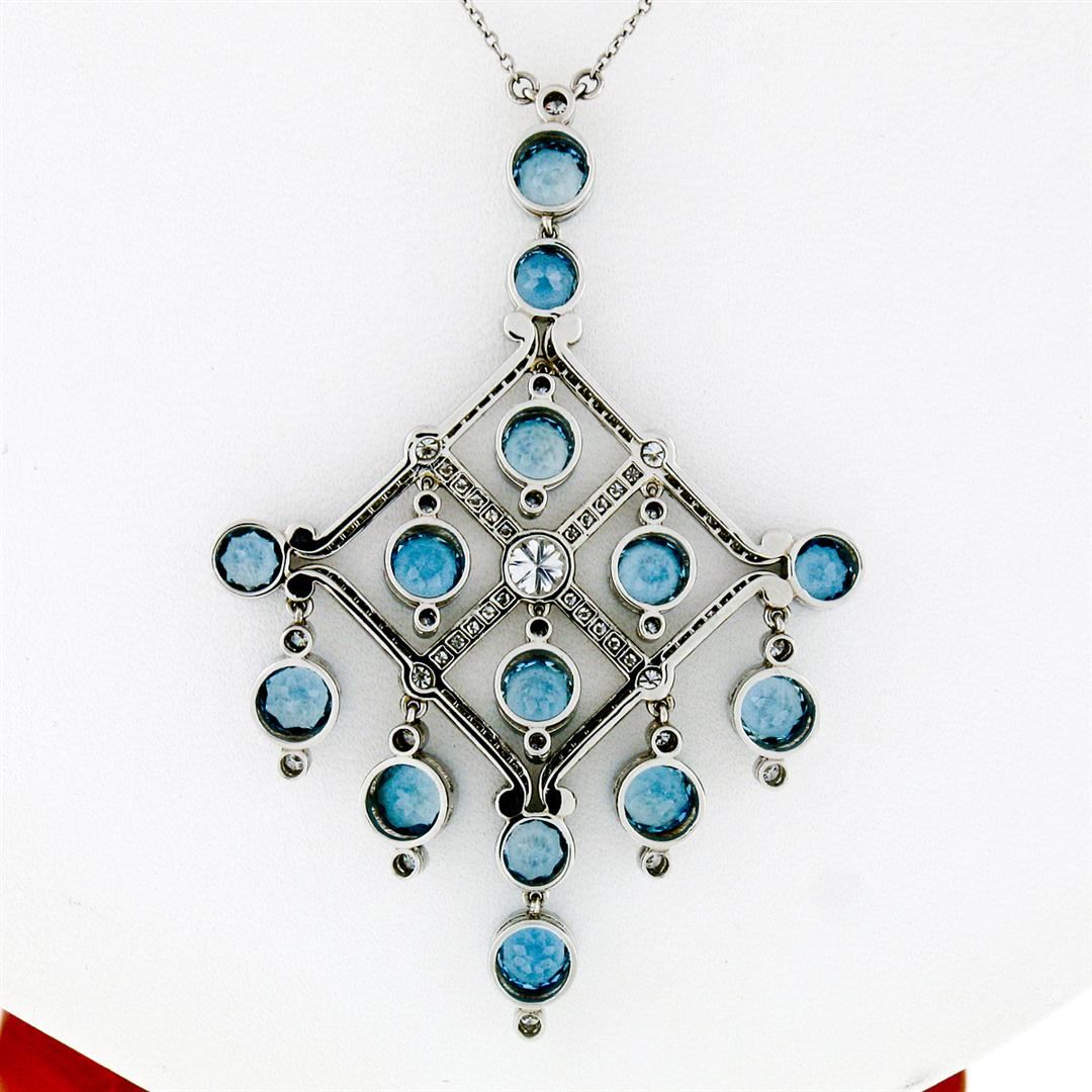 One Tiffany & Co. Jazz Platinum 7.20ctw Round Aquamarine Diamond Chandelier Necklace. Item Details - Material: Solid .950 Platinum, Weight: 18.00 Grams, Stone(s): (14) Natural Genuine Aquamarine - Round Brilliant Cut - Bezel Set - Rich Medium Blue Color - 6.00ctw (approx.), (1) Natural Genuine Diamond - Round Brilliant Cut - Bezel Set - E/F Color - VVS2/VS1 Clarity - 0.38ct (approx.), (106) Natural Genuine Diamonds - Round Brilliant Cut - Pavé Set - E/F Color - VVS2/VS1 Clarity - 0.82ctw (approx.), Total Carat Weight: 7.20 (approx.), Chain Type: Fine Cable Link, Chain Length: 16 Inches, Clasp: Spring Ring, Width: 42.00mm, Height: 61.00mm, Thickness: 5.00mm, Signature: Tiffany & Co. PT950 17334514, Condition: 100% authentic Tiffany & Co. pendant necklace. Like new condition!